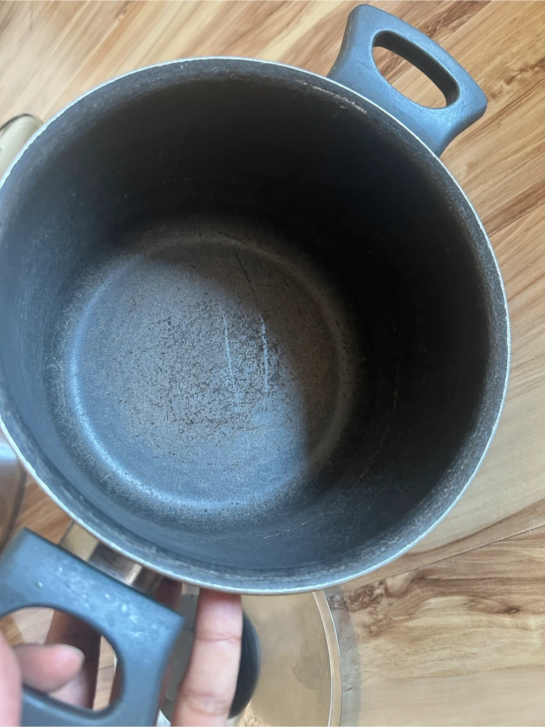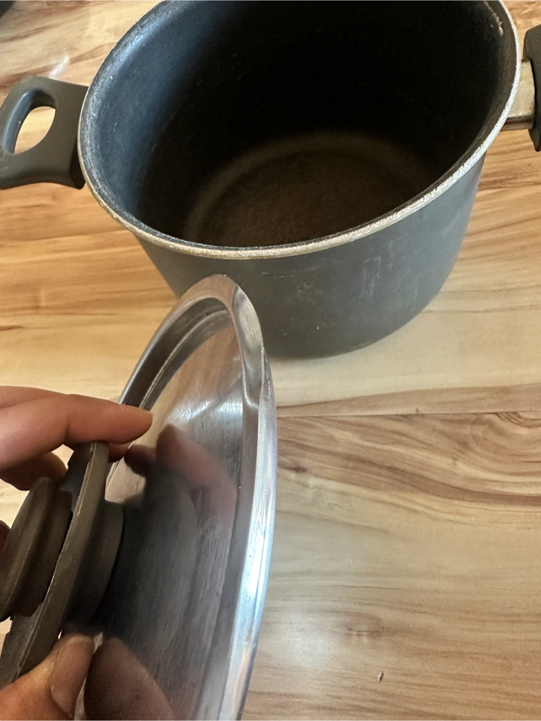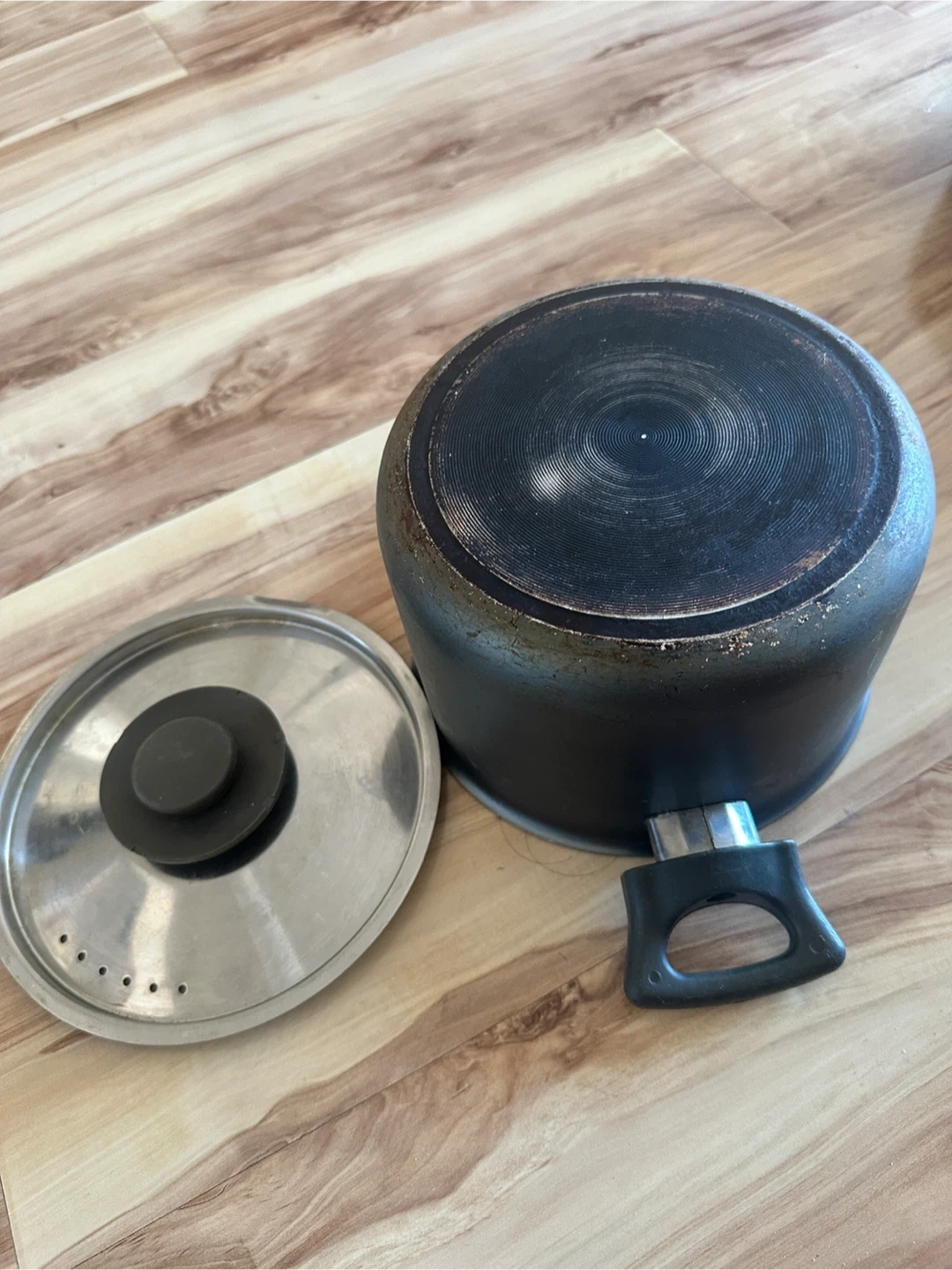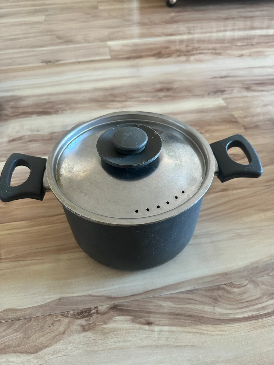 This is a saucepan with a stainless steel lid. It's made of metal with black handles. The lid has small holes for draining.