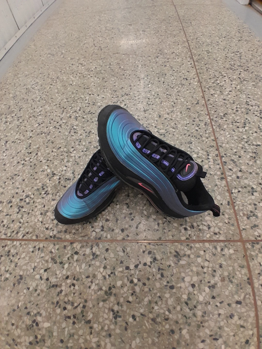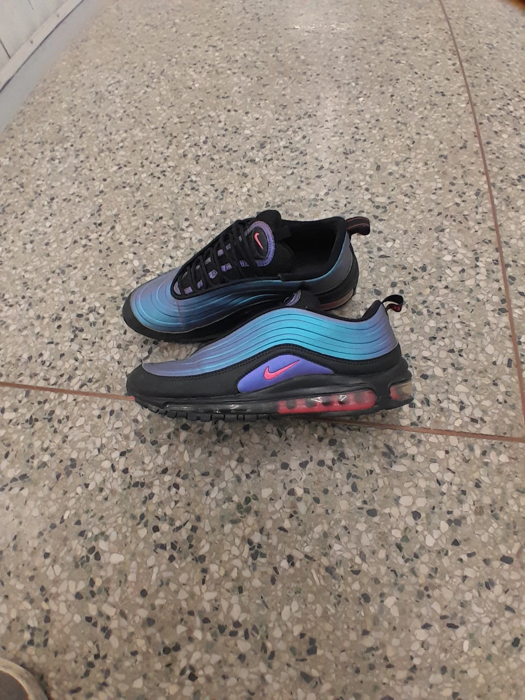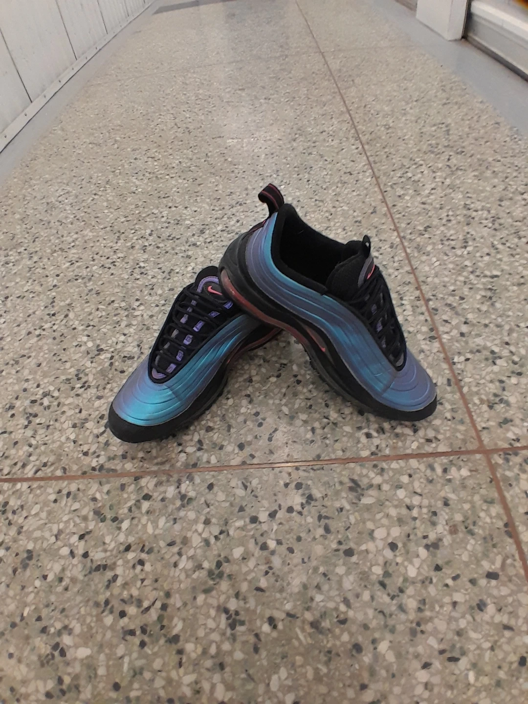 Nike Air Max 97 shoes feature a distinctive "Tear Drop" design with a shimmering blue and purple iridescent upper and black accents. They have a comfortable lace-up closure and the iconic Air Max cushioning. Perfect for adding a unique flair to your streetwear look! Women's size 9