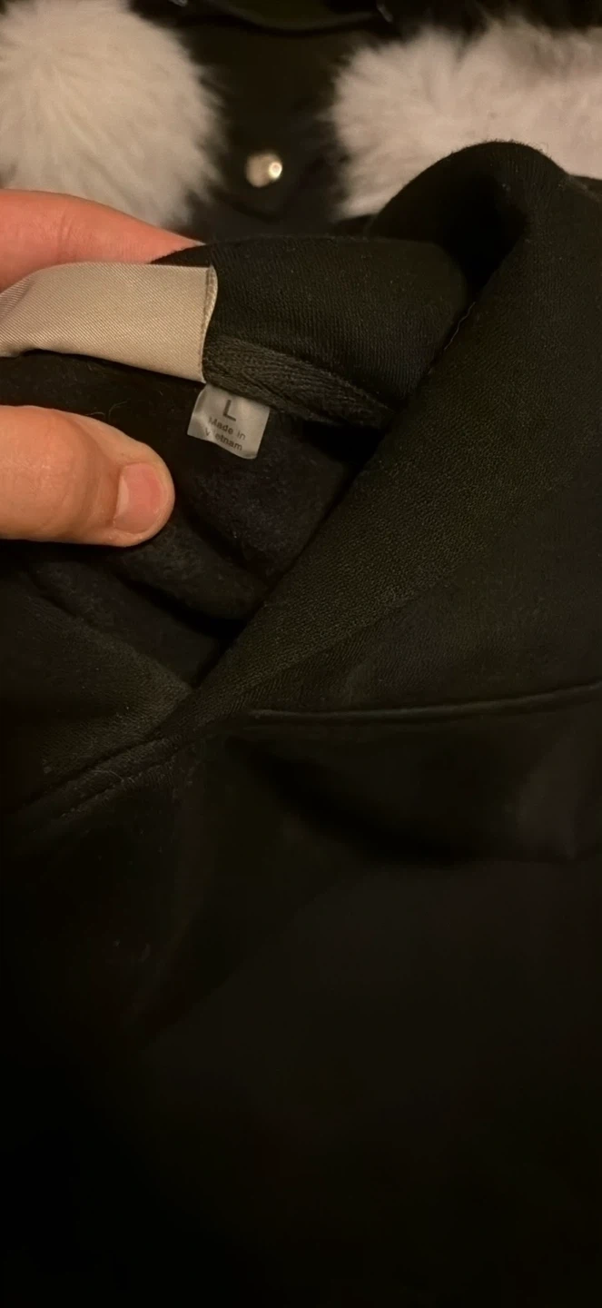 Black Fear of God Essentials hoodie. Size is large. Made in Vietnam. Fits M and large