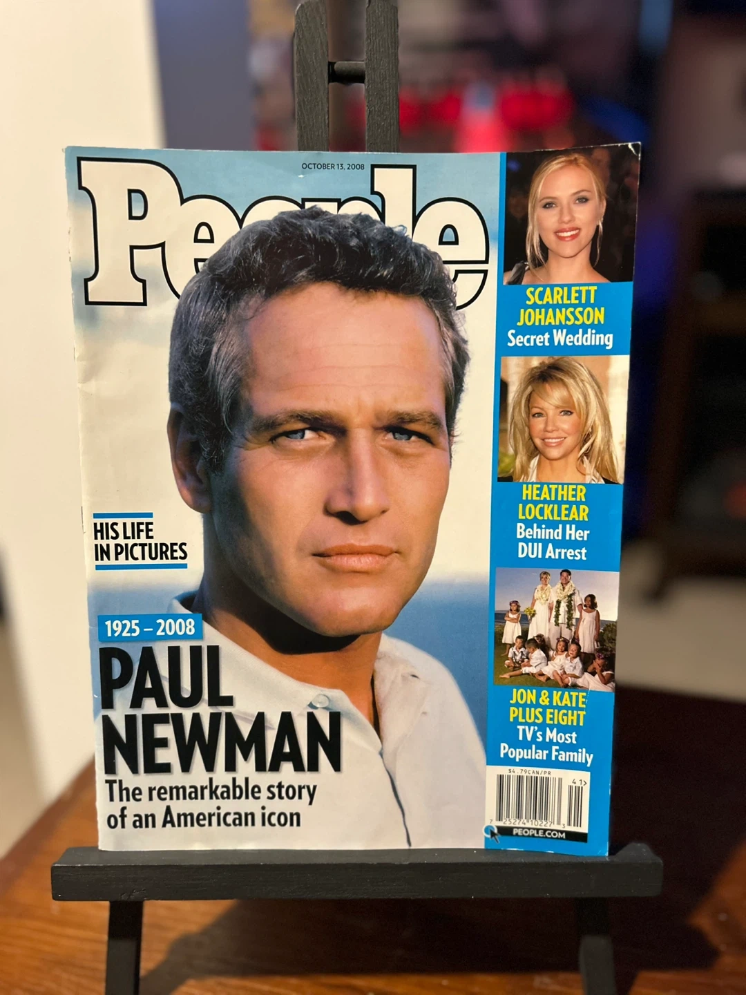 This People magazine issue from October 13, 2008, features Paul Newman. It covers his life in pictures and his remarkable story as an American icon. The magazine also includes articles on Scarlett Johansson's secret wedding and Heather Locklear's DUI arrest.