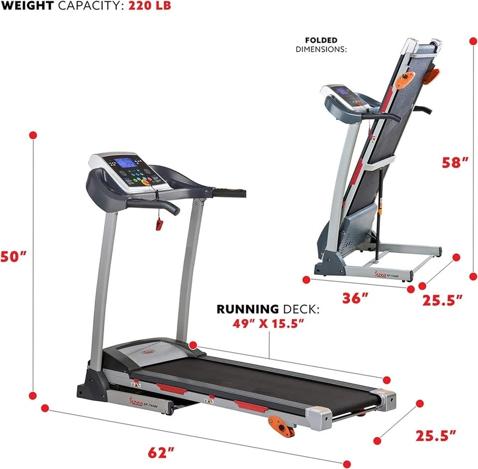 Experience reliable performance with a 2.20 peak HP drive system, providing speeds ranging from 0.5 to 9 MPH. Customize your workout with 3 manual recline options (0%, 2%, 4.37%). Choose from 9 built-in workout programs. The large LCD displays provide real-time information on time, distance, speed, calories burned, and pulse. Enjoy a generous running area with dimensions of 49" L x 15.5" W inches. Take control of your workout with handrail controls that allow you to adjust speed, start and stop the treadmill. The pause function lets you stop the belt while preserving your running data. Ensure safety during workouts with an emergency stop brake feature. This treadmill is designed for various users, providing stability and durability. Conveniently fold and unfold your treadmill with an easy folding mechanism and soft drop system. Effortlessly transport your treadmill within your home. Includes a convenient smartphone/tablet holder.