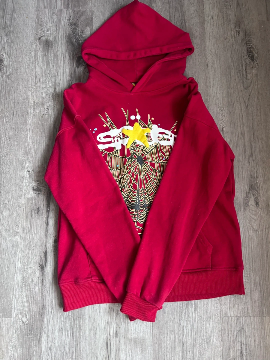 This is a red Sp5der hoodie with a yellow star and web graphic. It's made of 100% cotton. Great for casual wear!