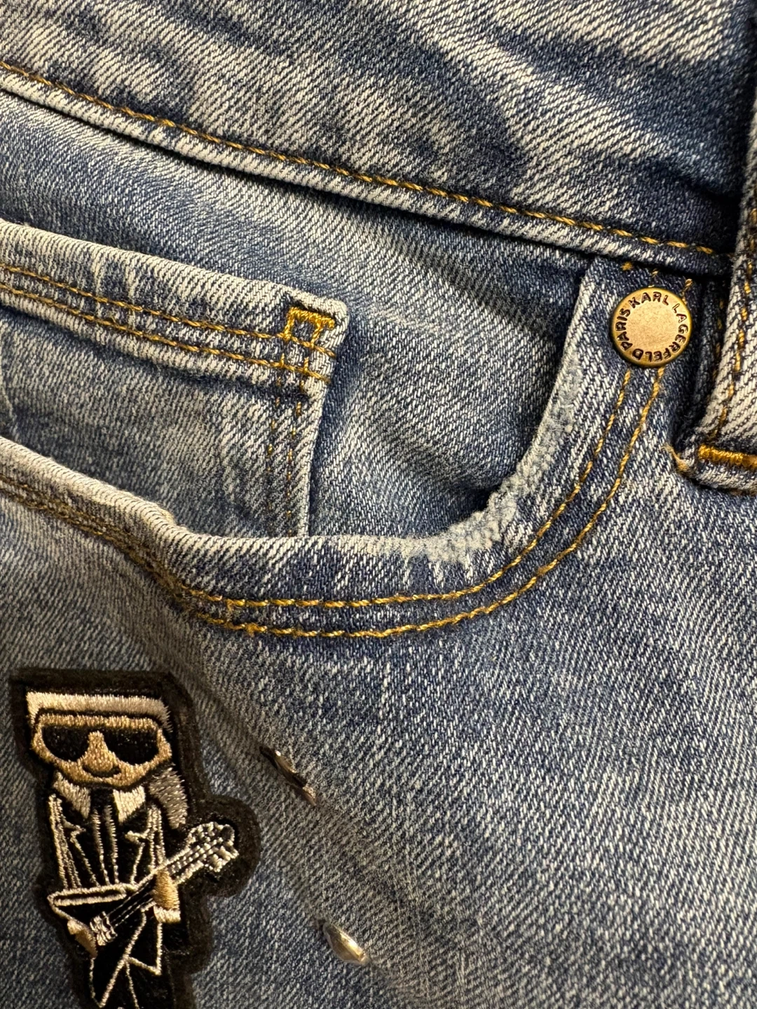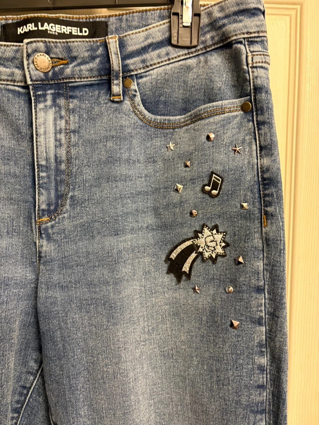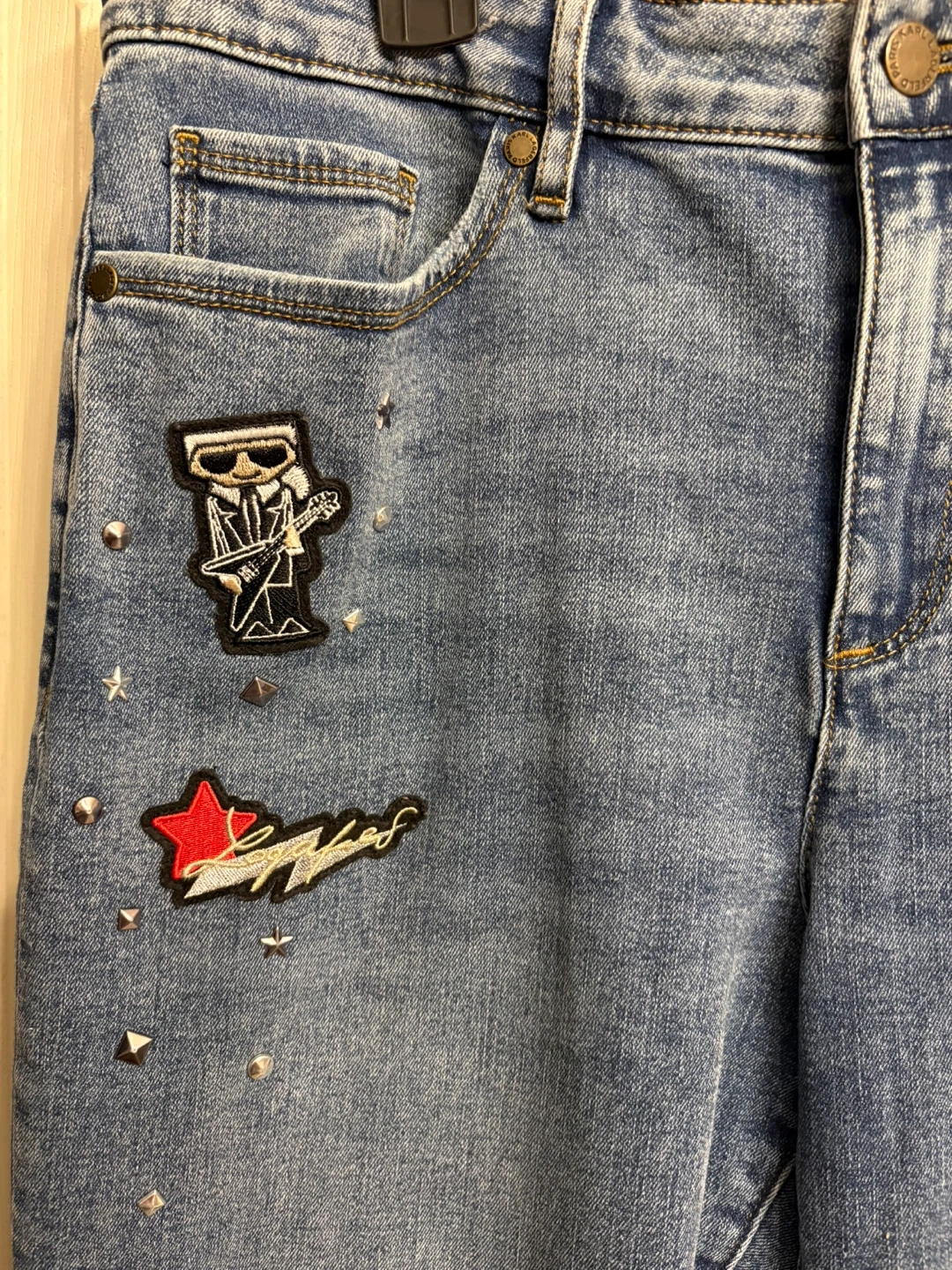 These Karl Lagerfeld jeans are a size 12. They feature a light wash denim with embroidered patches and stud details. Great condition, just like new! Pick up in Chestermere.