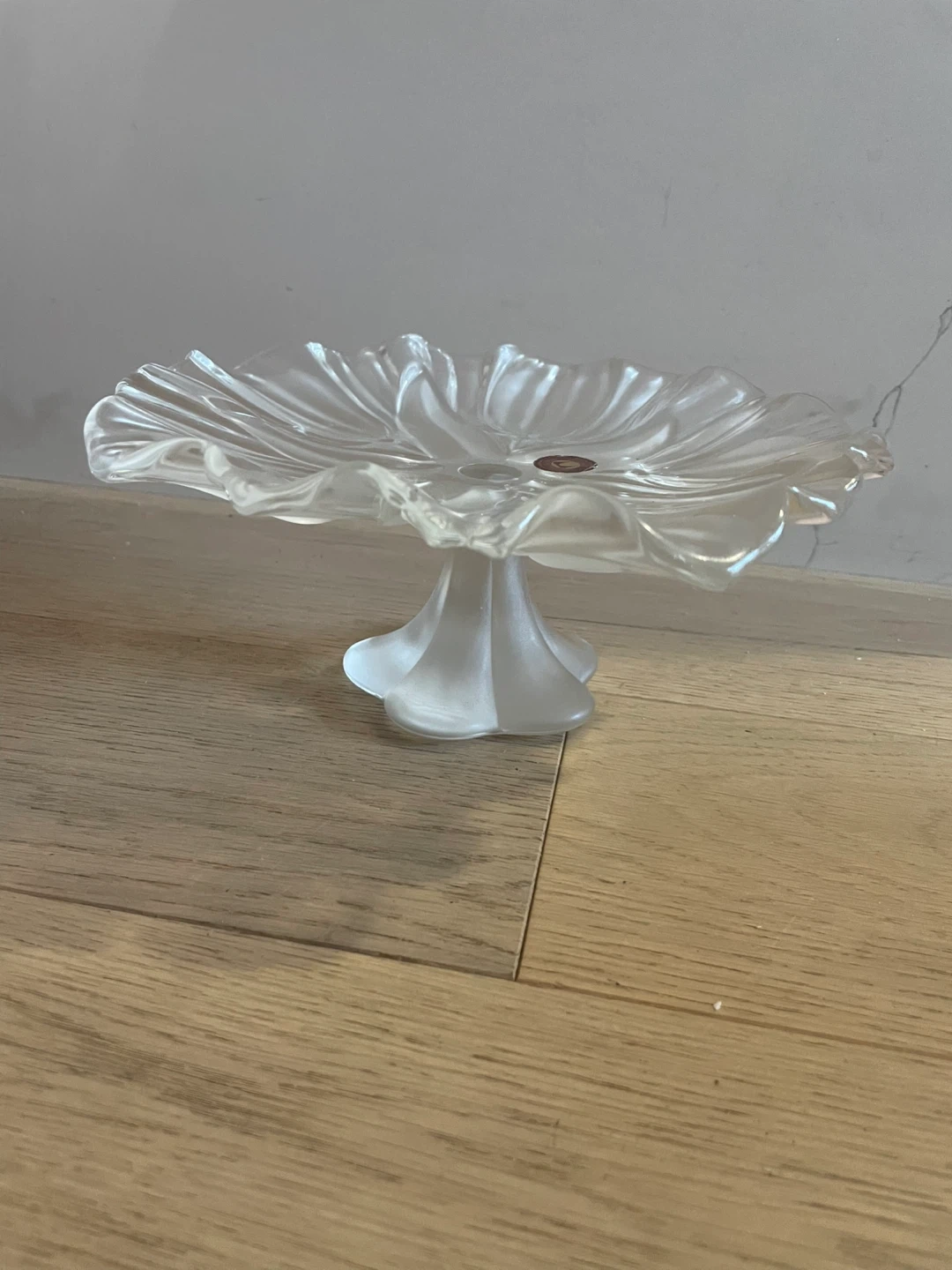 This is a clear glass cake stand with a fluted edge design. Its frosted stem provides a nice contrast to the clear glass. It's perfect for displaying desserts or appetizers at any gathering!
