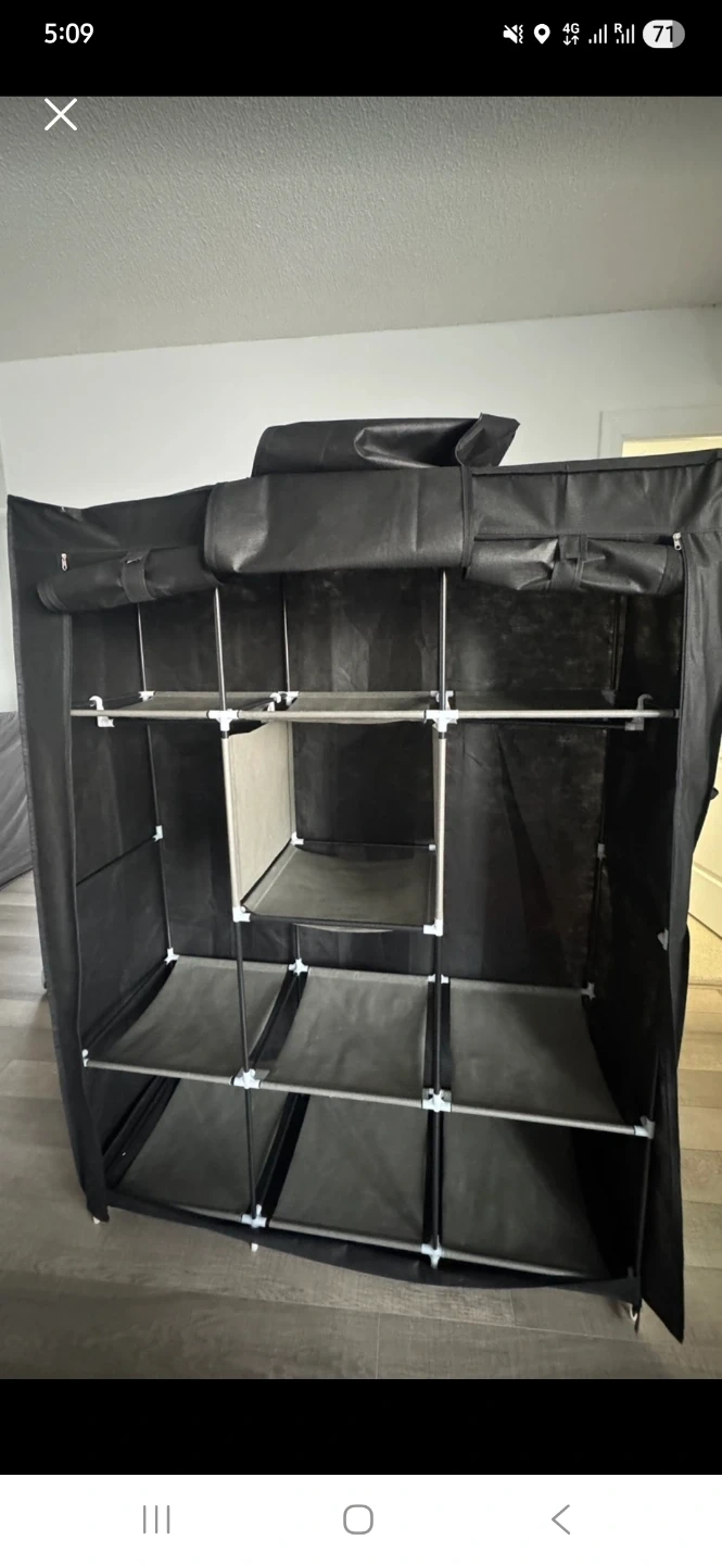 This portable wardrobe provides ample storage with multiple shelves. It's made of non-woven fabric and a metal frame. A great solution for extra clothing or accessory storage!