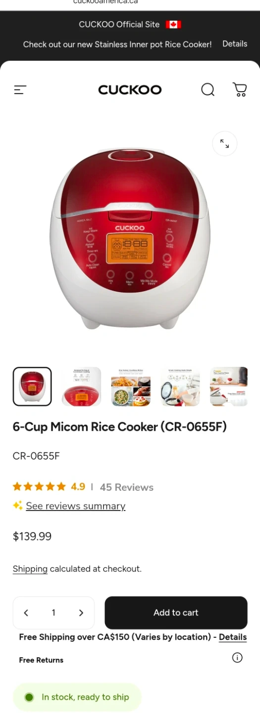 Korean brand Cuckoo Electric Rice Cooker/Warmer, model CR-0655F. Original price $139.99+tax