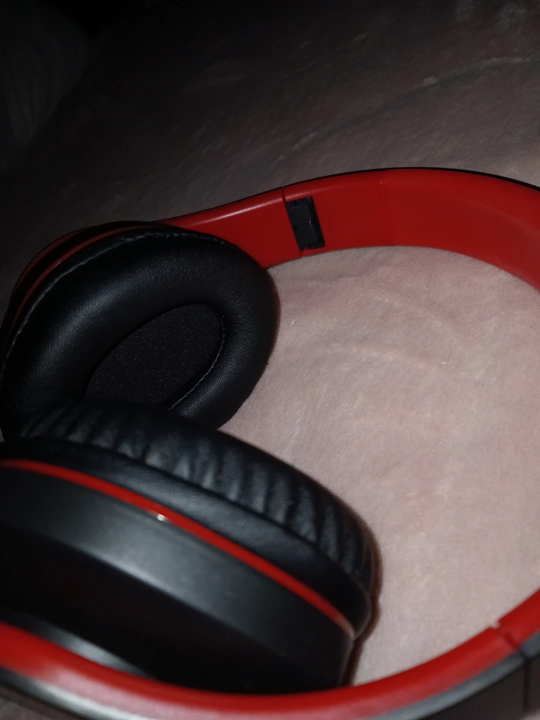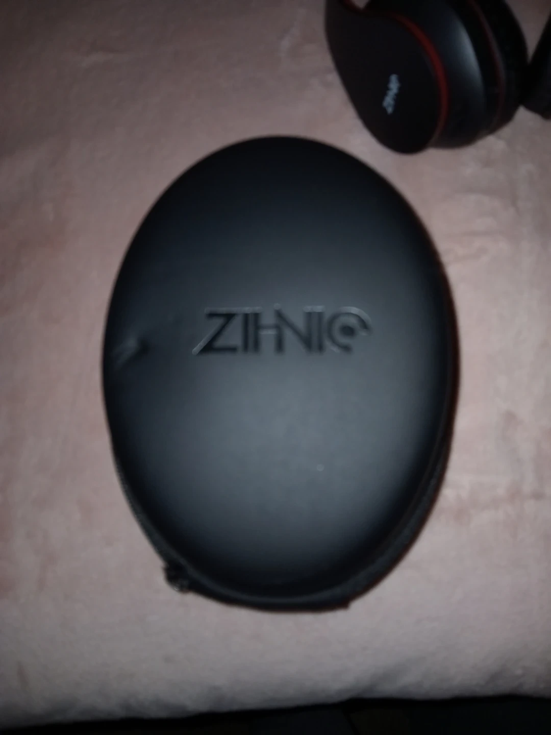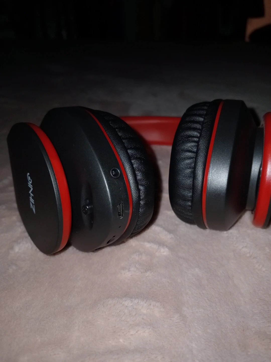 ZIHNIC over-ear headphones in red and black. These foldable headphones come with a protective zippered case. They're comfortable for extended wear. Also comes with a charging cable.