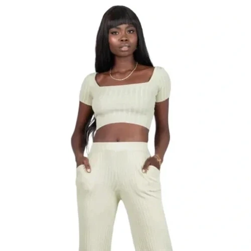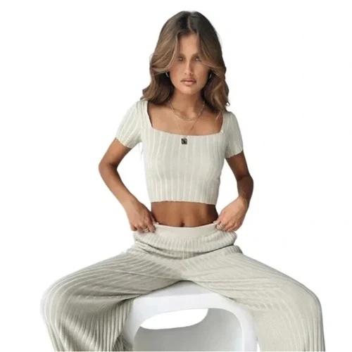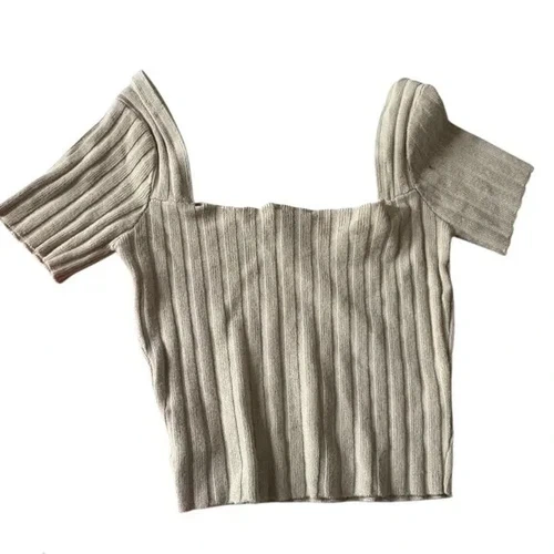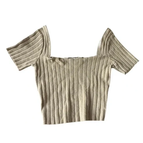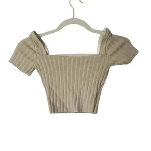 Cream Princess Polly cropped baby tee. Slim fitting, knit ribbed material. Features an inner silicone strip along shoulders and a wide neckline. Unlined.