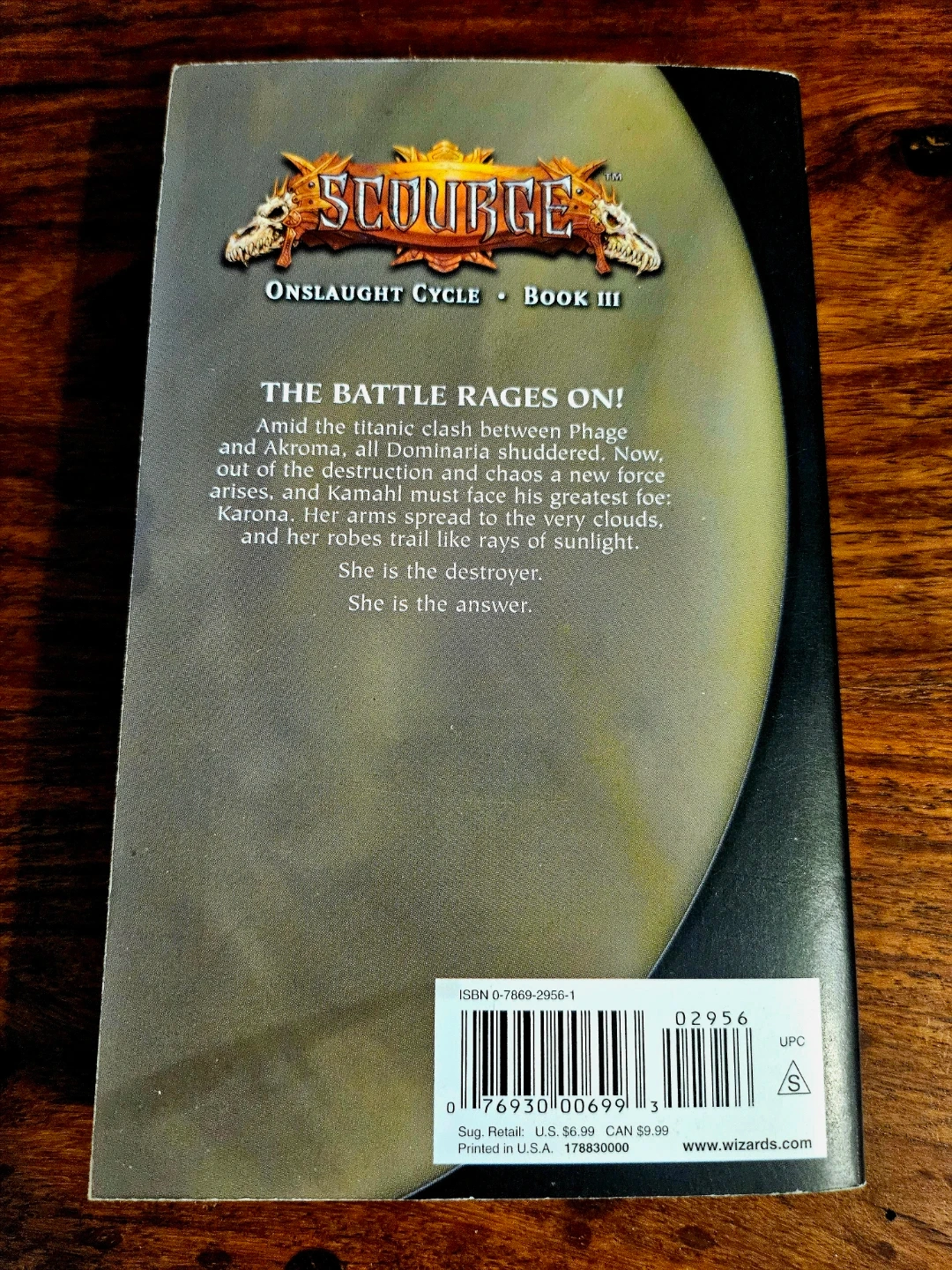 Magic The Gathering Scourge, Book III of the Onslaught Cycle. Written by J. Robert King. This novel is part of the Magic lore. It's about the battle between Phage and Akroma.