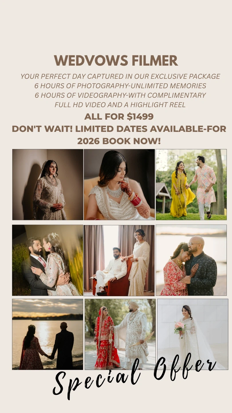 This package offers 6 hours of photography and 6 hours of videography, including a complimentary full HD video and highlight reel. Bookings are available for 2026. Capture your perfect day with unlimited memories!