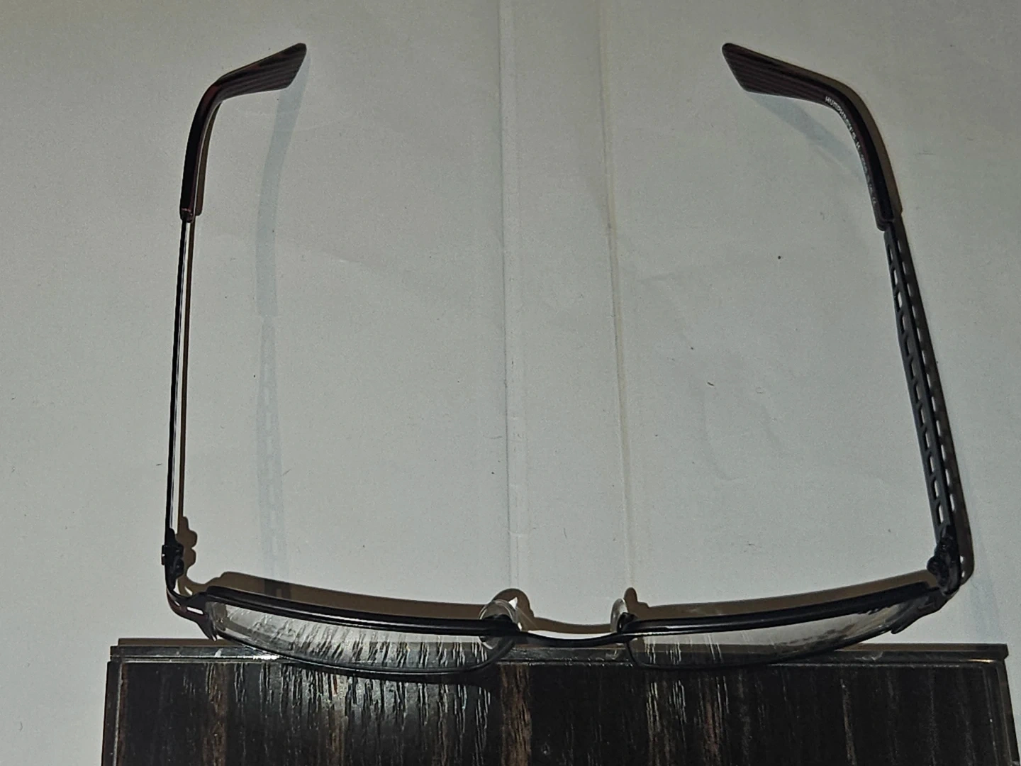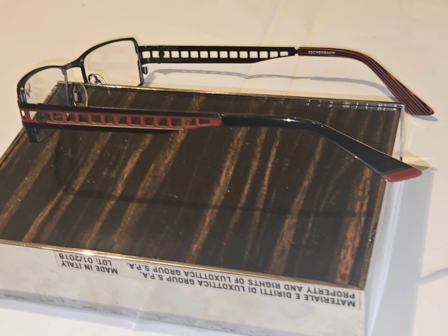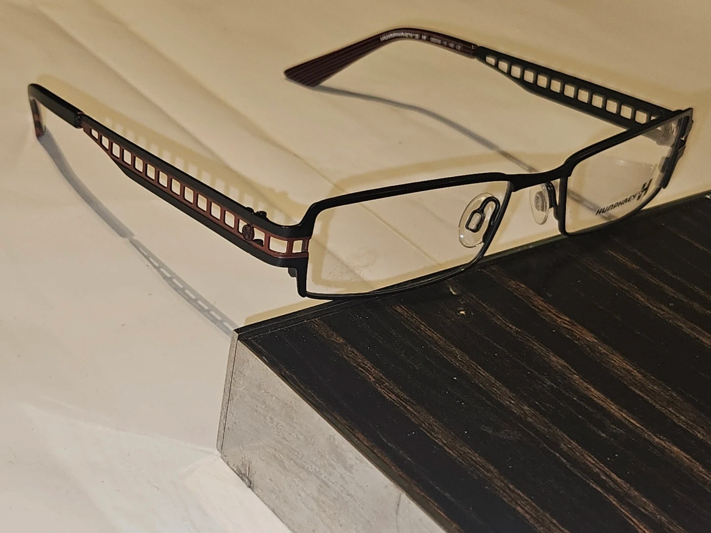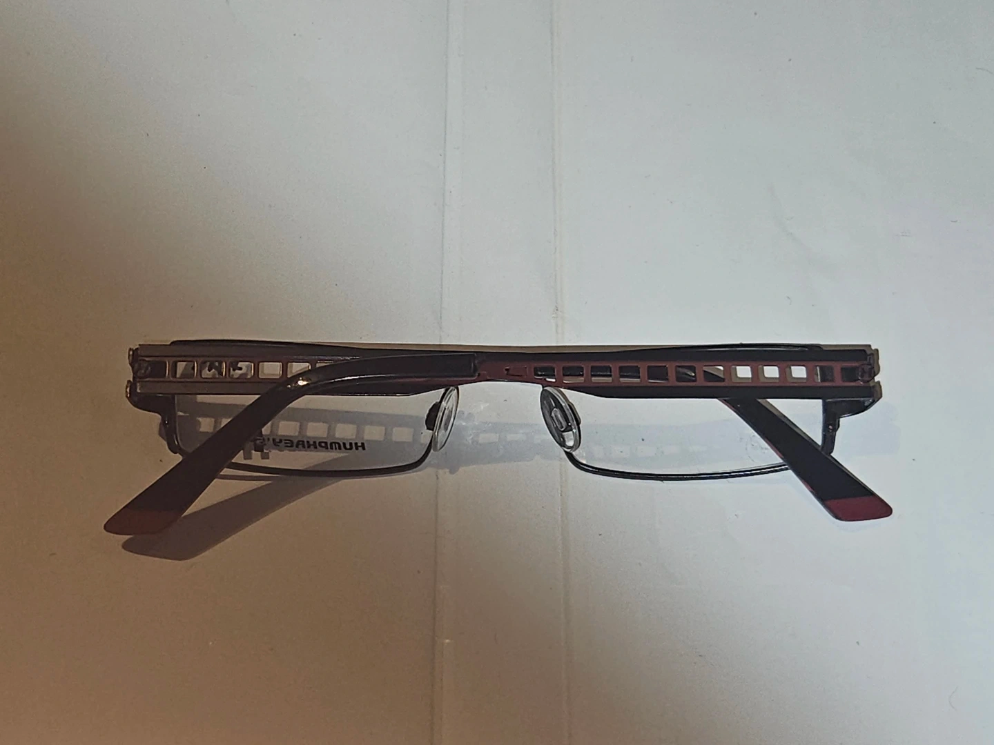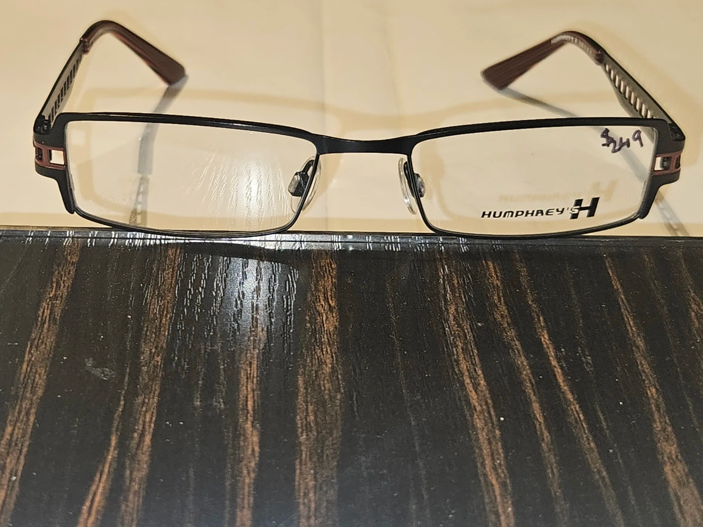 Humphrey's Eyewear glasses frames in black and maroon. The frames are metal with decorative cutouts on the temples. They have a 140mm temple length in dark red, and are designed to fit any type of Prescription lenses.
