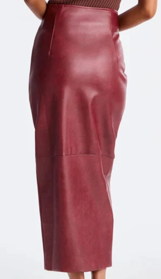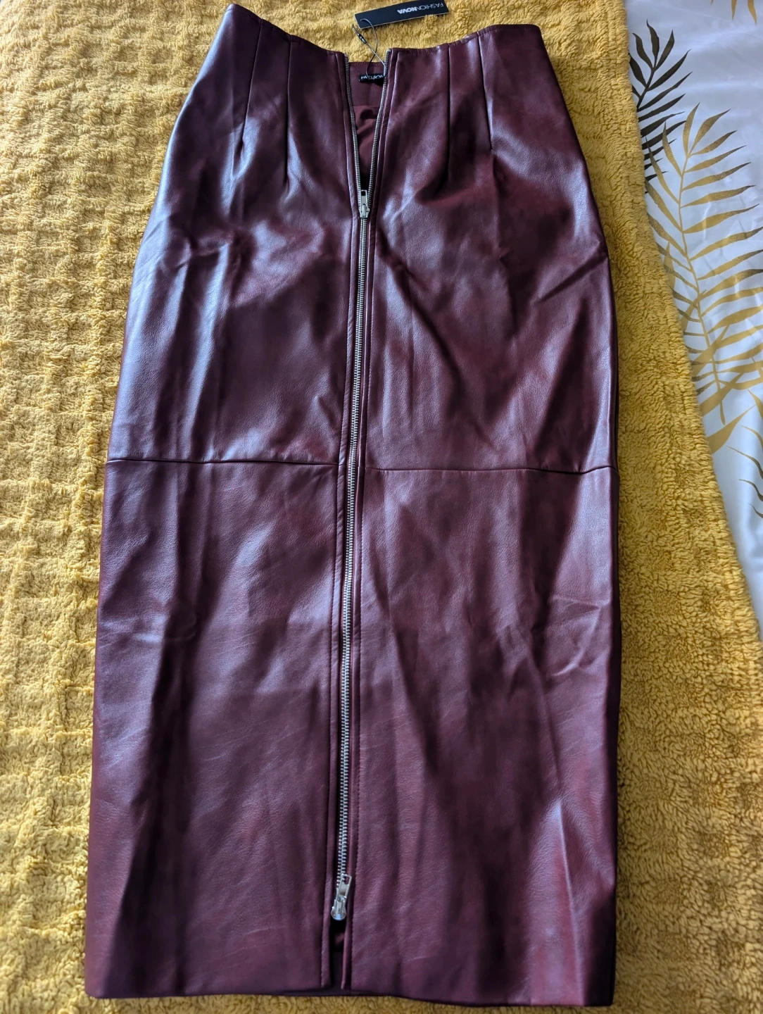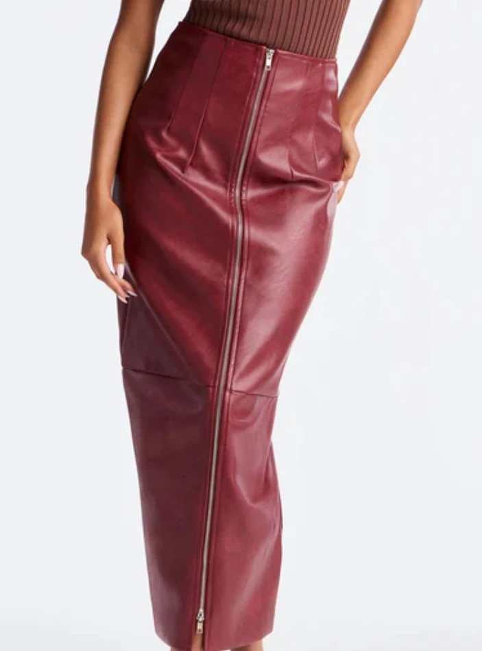 This is a burgundy faux leather midi skirt. It features a full-length zipper closure and a sleek, bodycon silhouette. It's a stylish choice for evening wear.