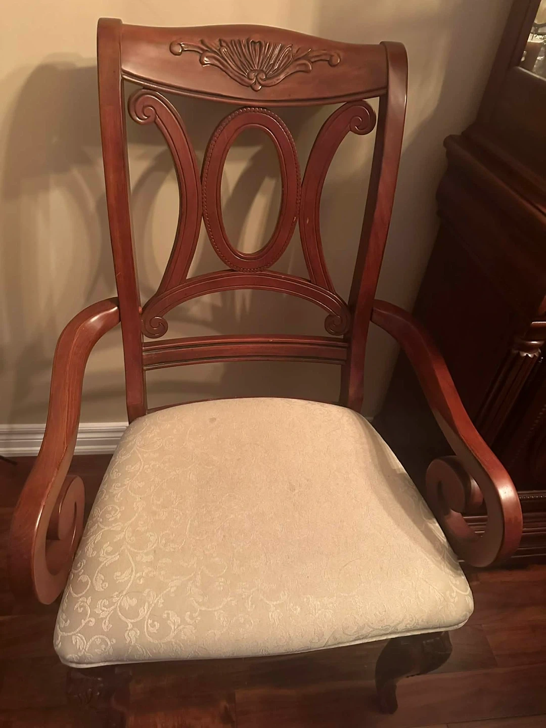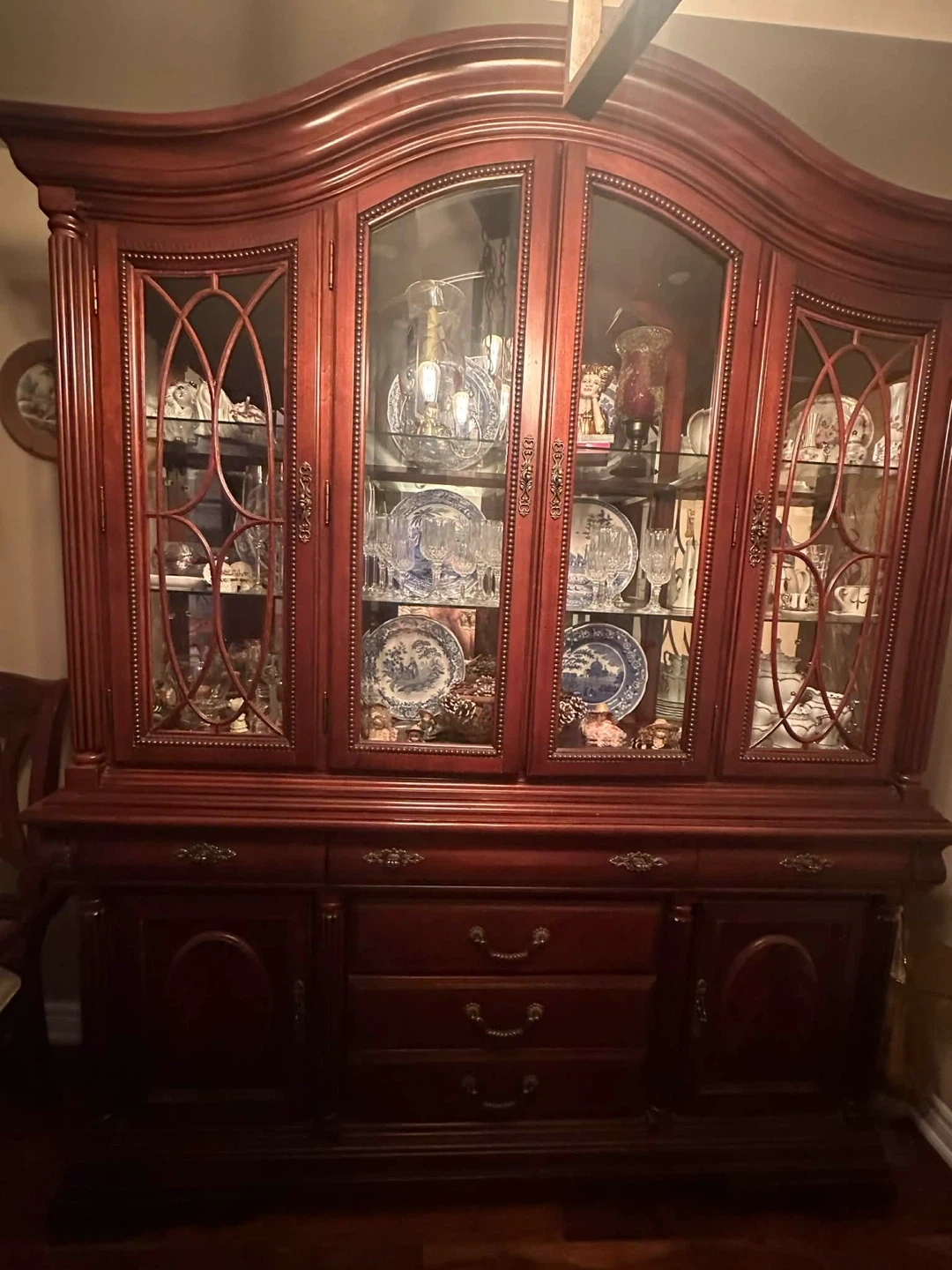 Beautiful solid wood dining set including a large china cabinet, dining table, and four chairs. The china cabinet features glass doors and ample storage. The table is oval-shaped with a rich wood finish. Chairs have upholstered seats.