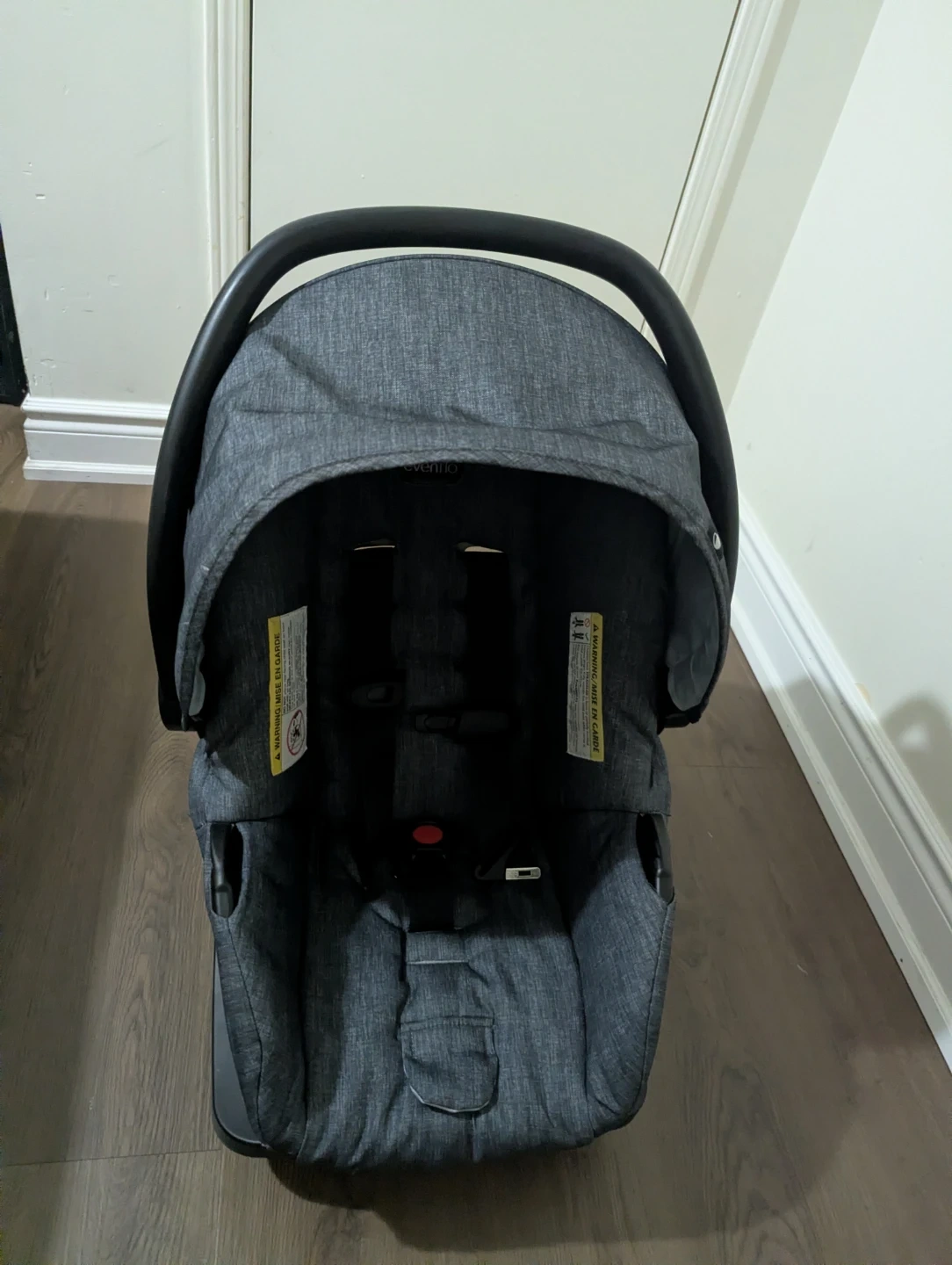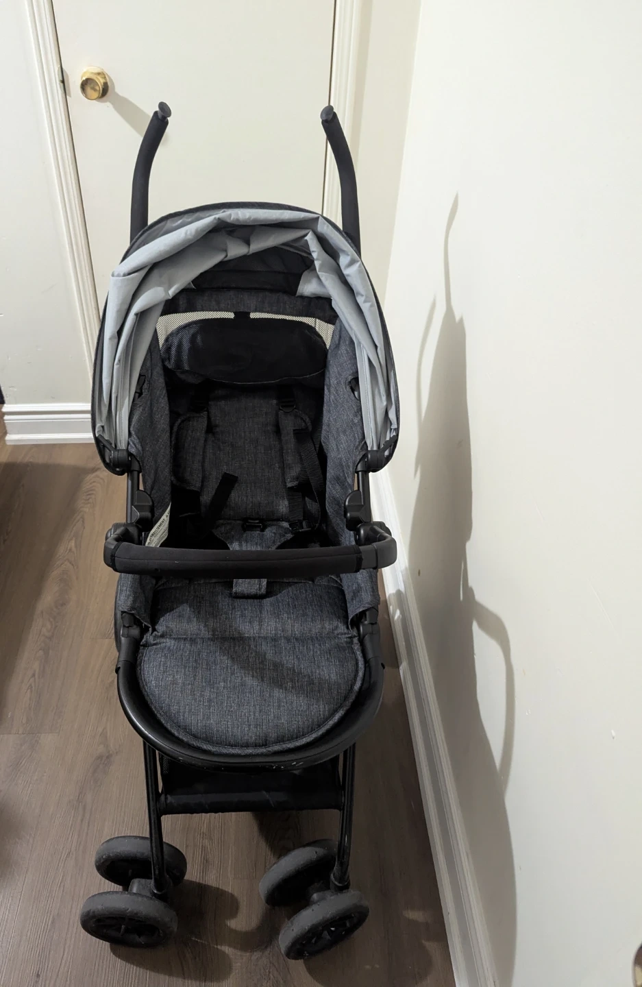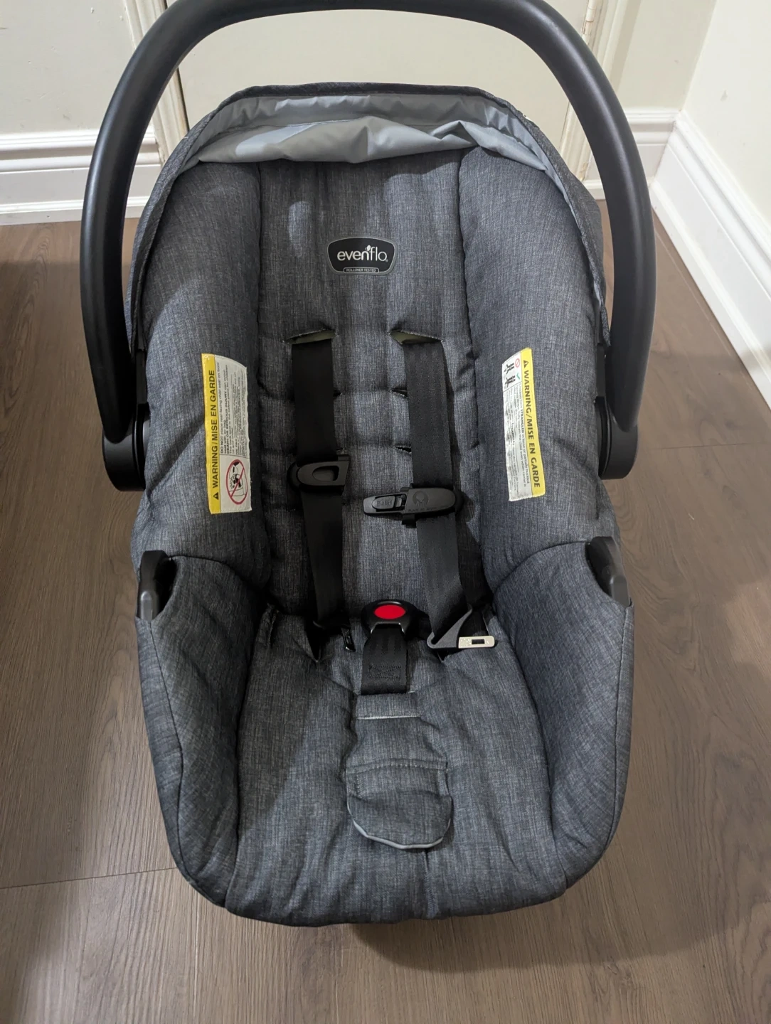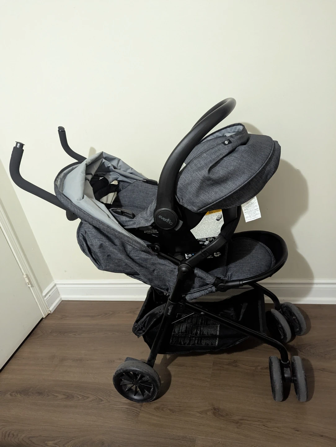 Evenflo car seat and compatible stroller. It's a grey, speckled fabric. Stroller has a canopy and storage basket.Very easy and convenient to use, very comfortable for your little one. You can attach car seat in stroller as well you can use only stroller as well.