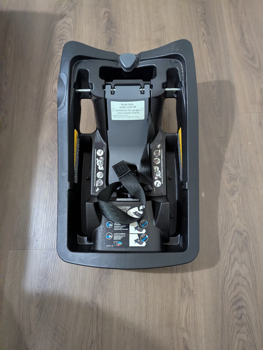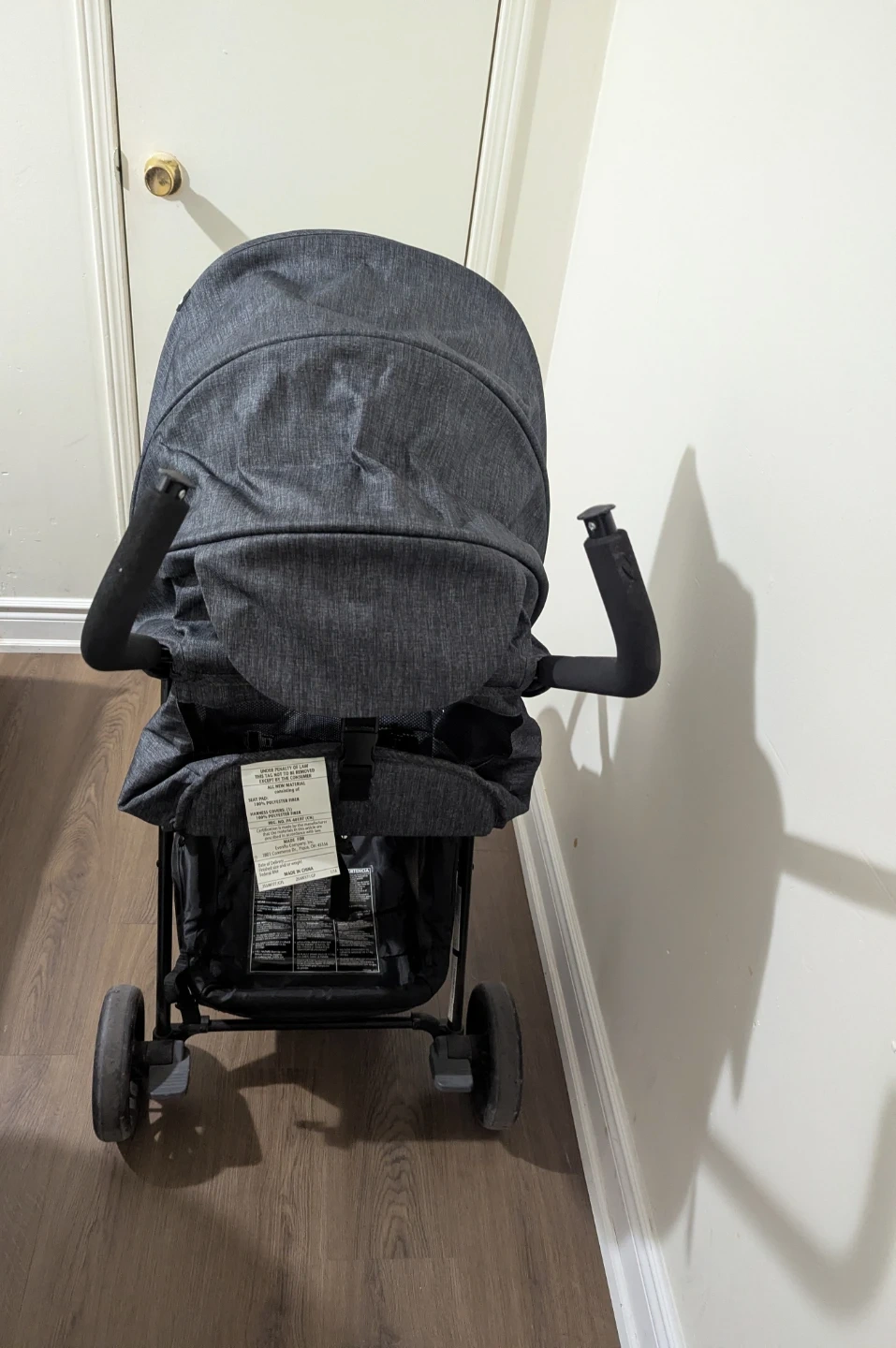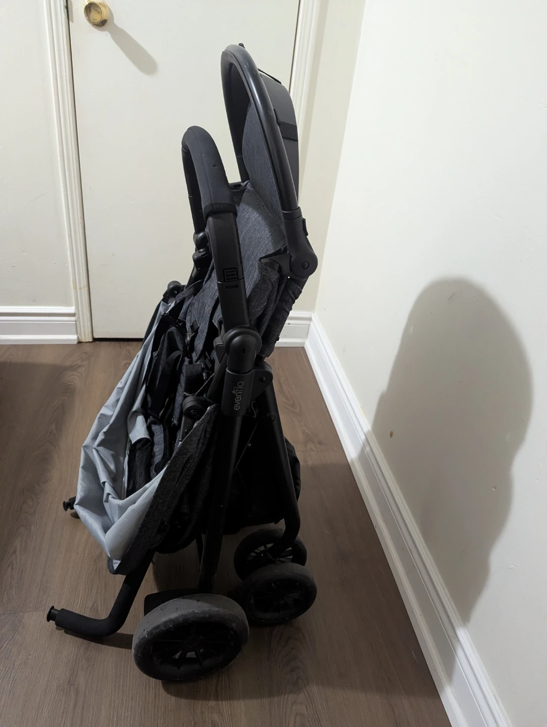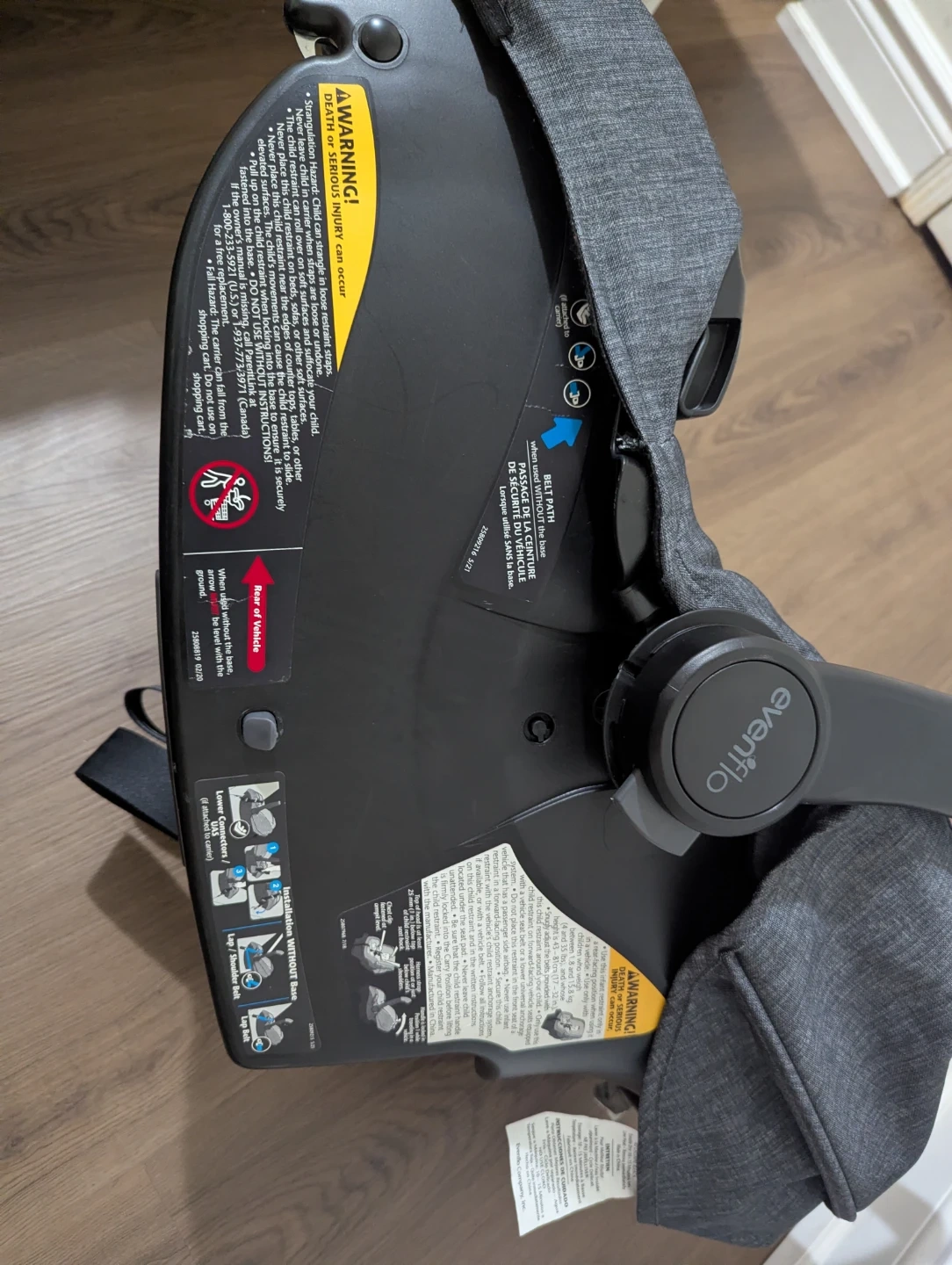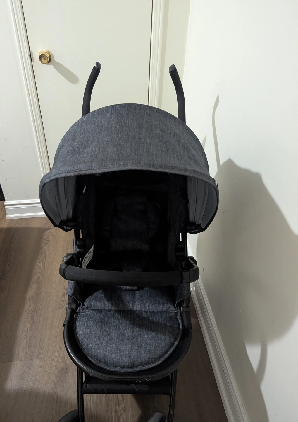 Evenflo car seat and compatible stroller. It's a grey, speckled fabric. Stroller has a canopy and storage basket.Very easy and convenient to use, very comfortable for your little one. You can attach car seat in stroller as well you can use only stroller as well.