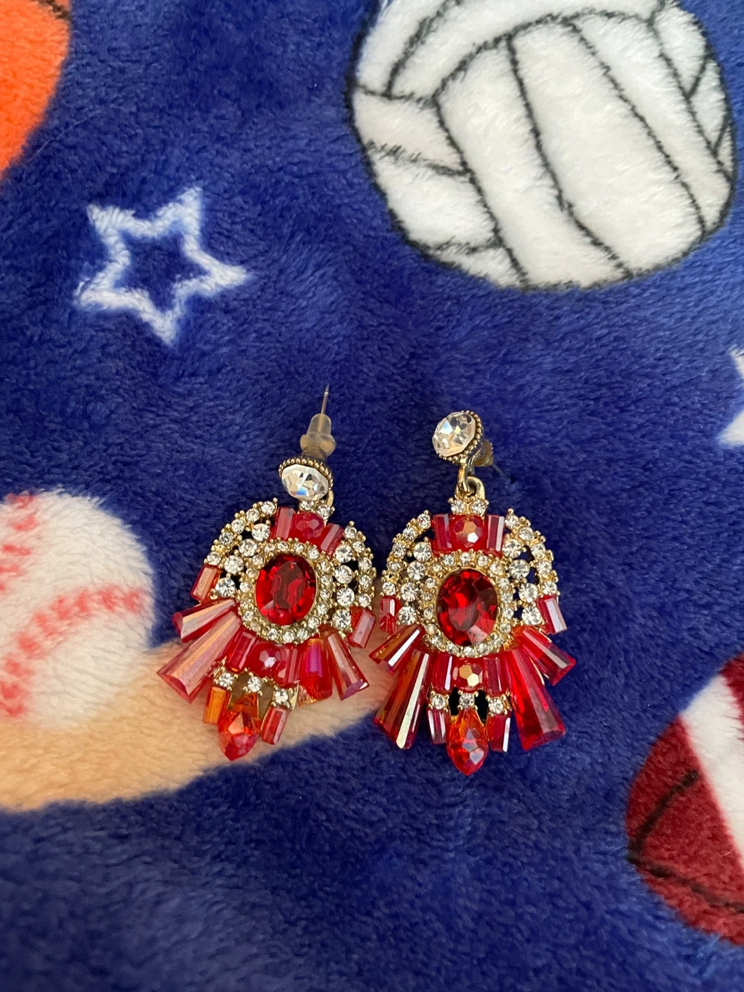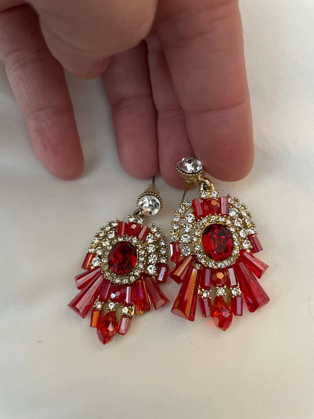 Sparkling red and clear rhinestones set in gold-tone metal. These statement earrings dangle with a fan-like design. They're perfect for adding a touch of glam to any outfit!
