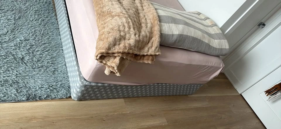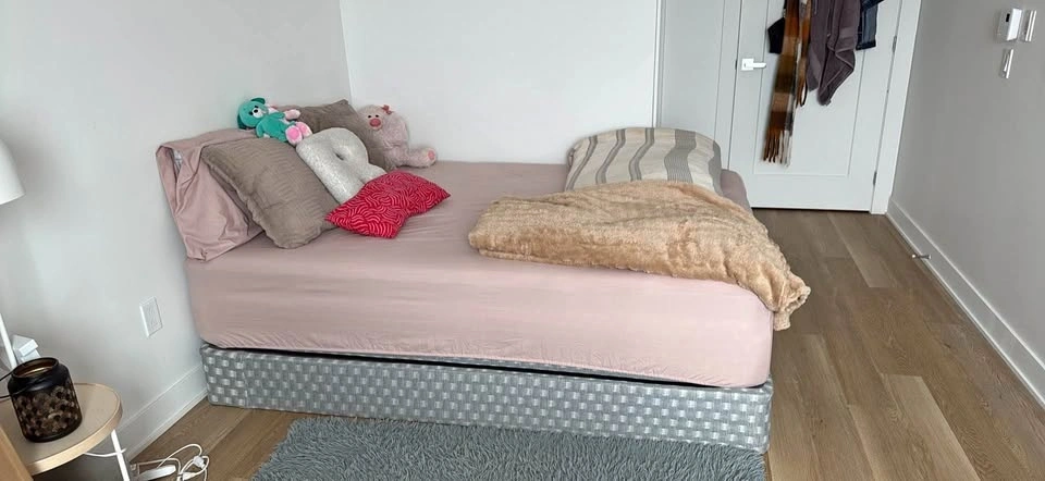Selling my Queen size boxspring in excellent condition. It's very sturdy and has a modern textured grey fabric finish, so you can use it without a bed skirt for a clean look. Dimensions are standard Queen (150cm x 200cm). Very clean, like new, no stains or tears. Elegant grey upholstery fits any bedroom style. From a smoke-free home. Boxspring only (mattress and bedding not included). The boxspring is one solid piece (not disassembled). Pickup near Royalmount.