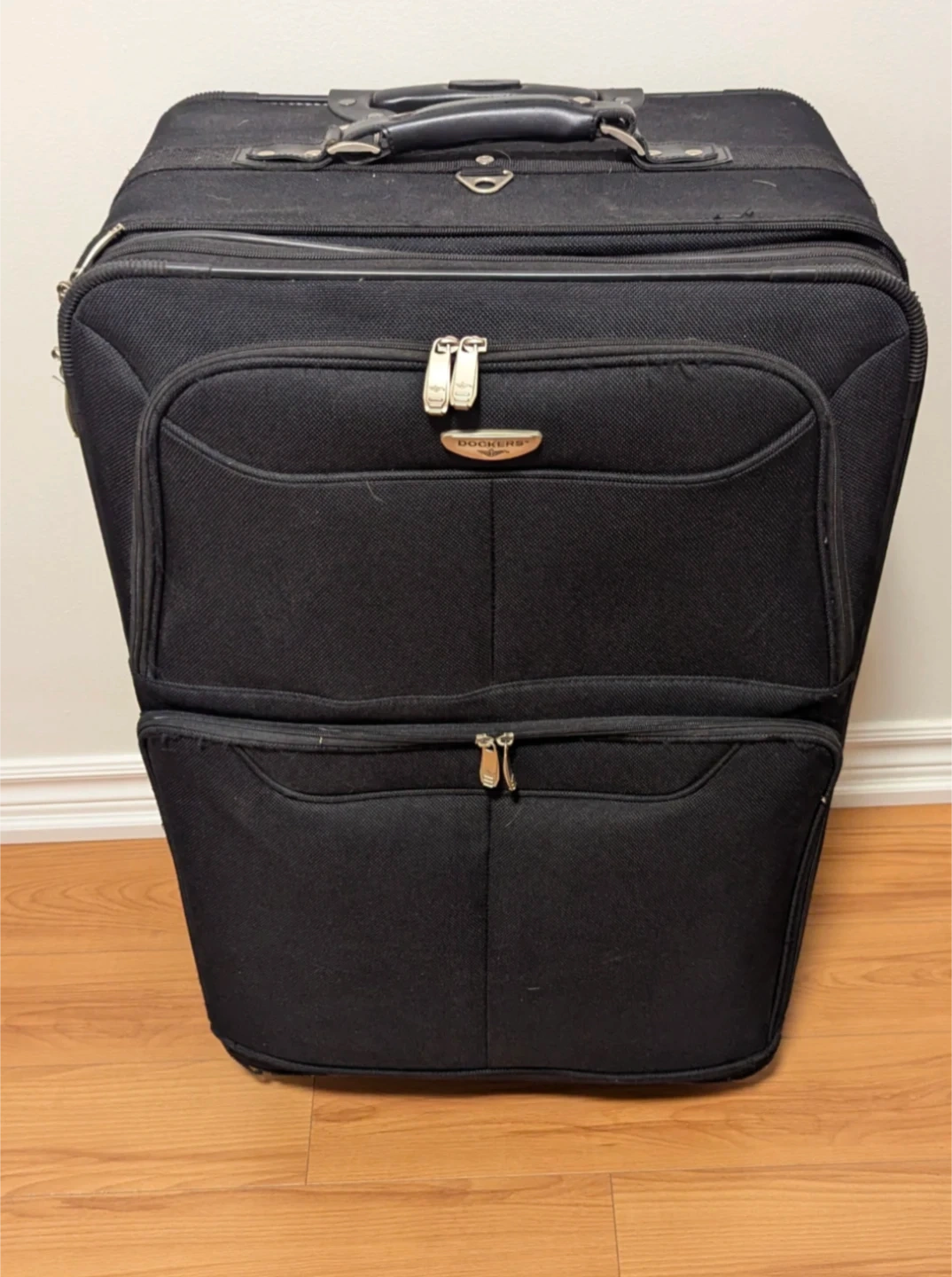 603I'm selling a Dockers rolling suitcase. It's black and has a handle and wheels for easy transport. L