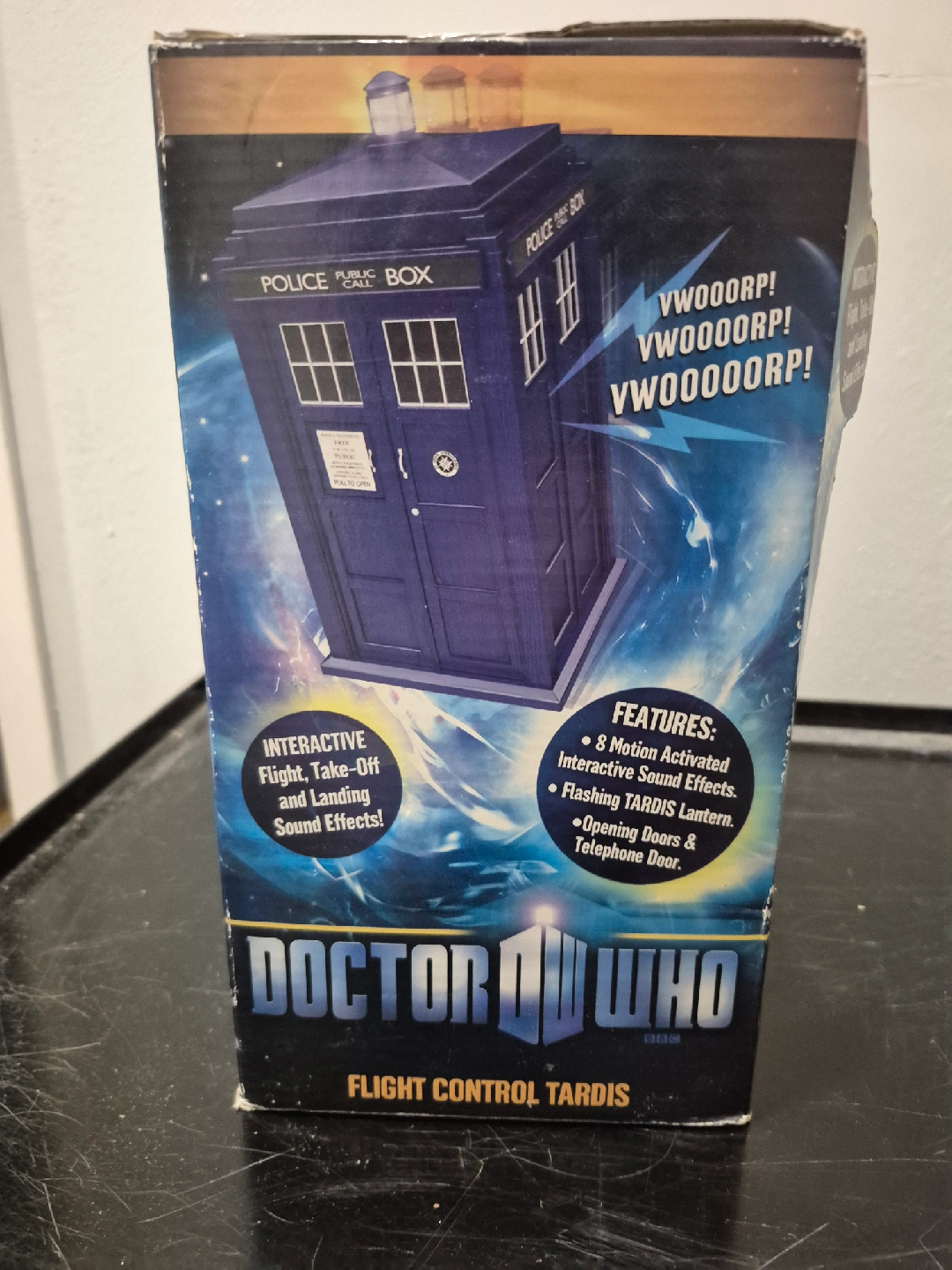 60Get ready for intergalactic adventures with this Doctor Who Flight Control TARDIS! It features interactive flight, take-off, and landing sound effects. The TARDIS also has: - 8 motion-activated interactive sound effects - Flashing TARDIS lantern - Opening doors and telephone door slightly damaged box, but unopened.