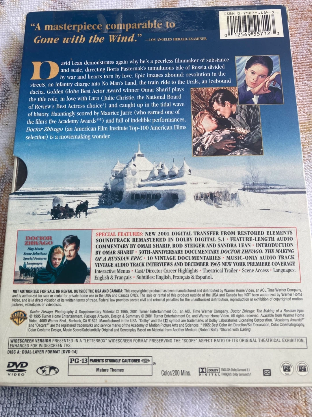 Selling a DVD of Doctor Zhivago. The DVD includes special features such as a new 2001 digital transfer from restored elements, soundtrack remastered in Dolby Digital 5.1, feature-length audio commentary by Omar Sharif, Rod Steiger, and Sandra Lean, and introduction by Omar Sharif. Also includes a 50th anniversary documentary, vintage audio track interviews, and more!