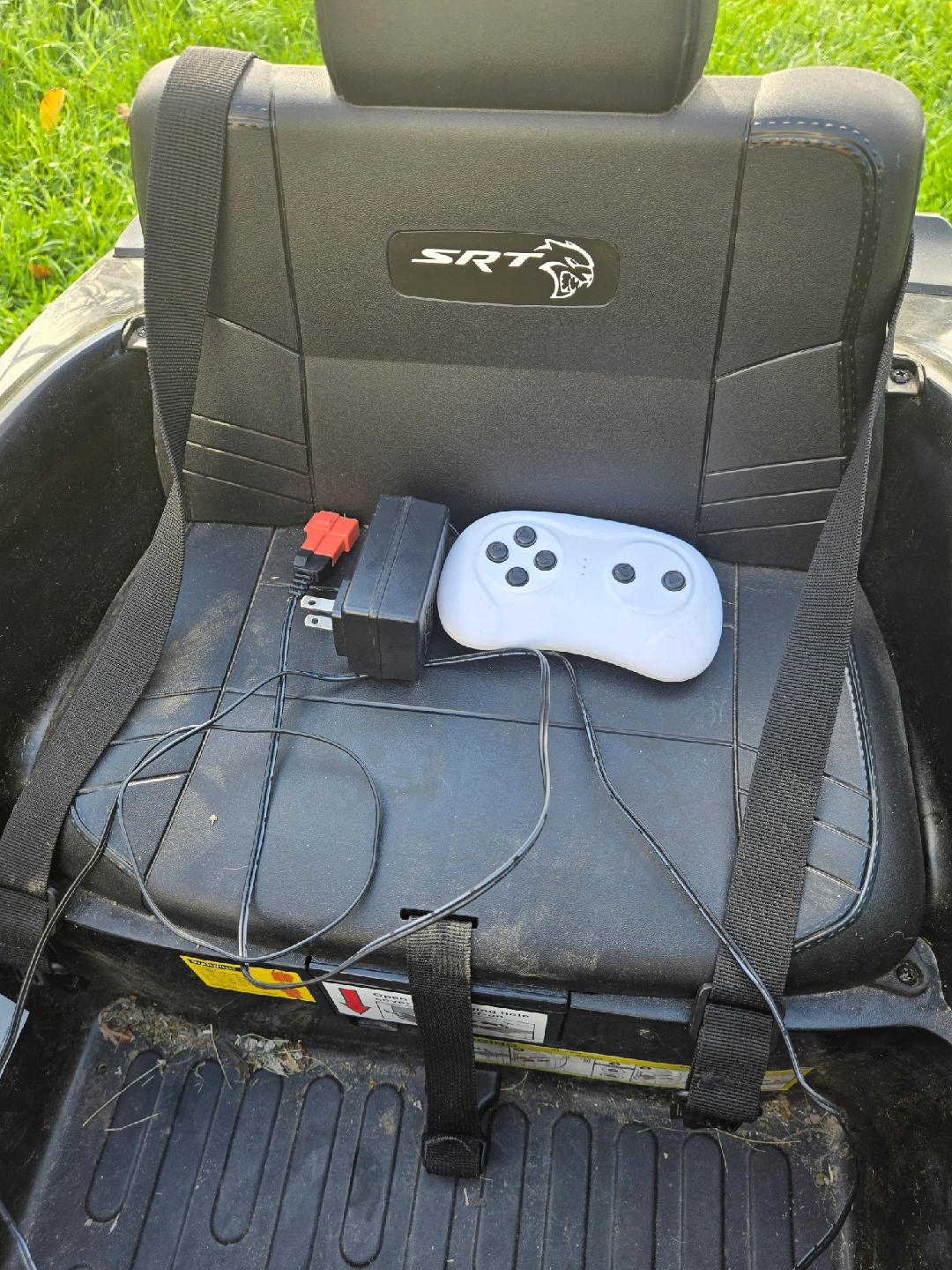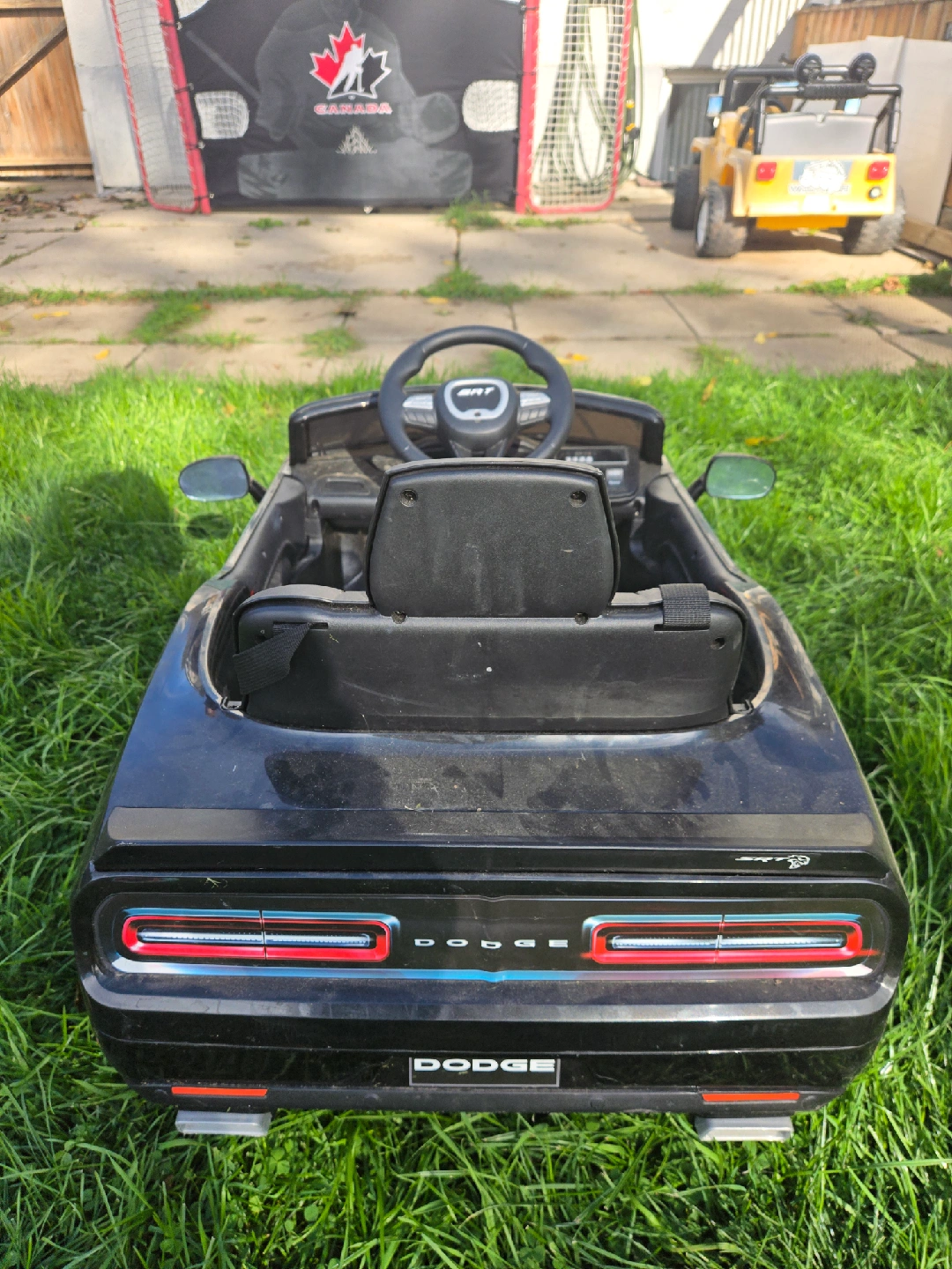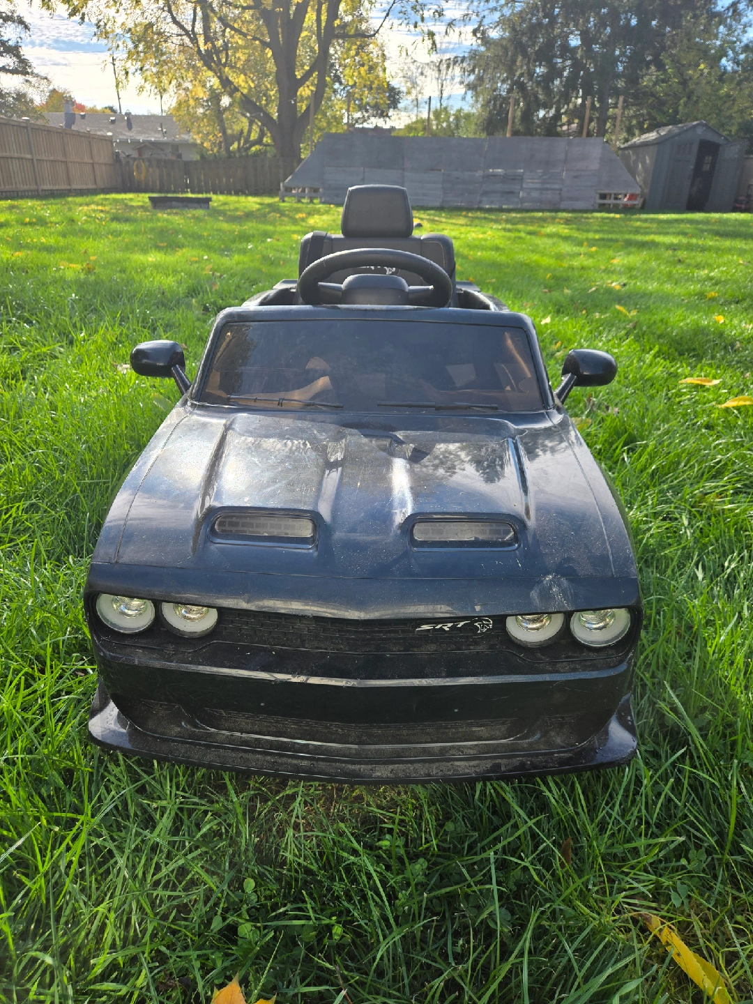10Selling a Dodge Challenger SRT ride-on car for kids! It's black and comes with a remote control and charger. Perfect for some outdoor fun!