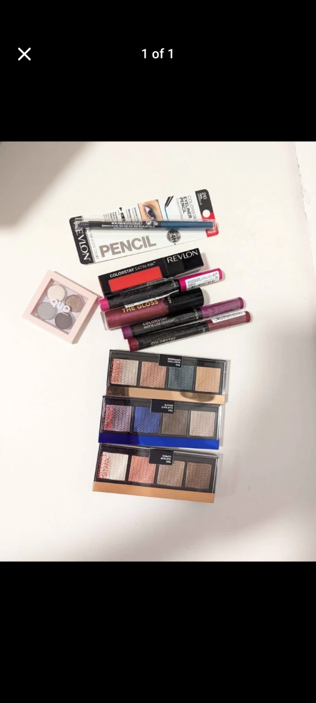 This includes Revlon Colorstay Eyeliner Pencil, Revlon Colorstay Satin Ink lipstick, and QUO eyeshadow quad. Also includes three Revlon The Gloss lip glosses. Three Revlon eyeshadow palettes are also included.