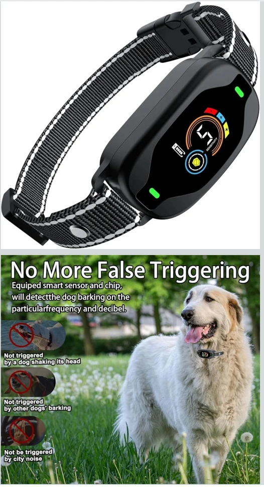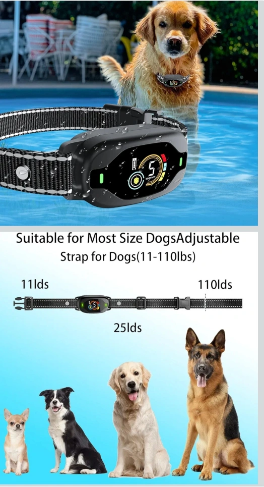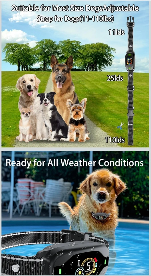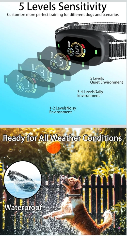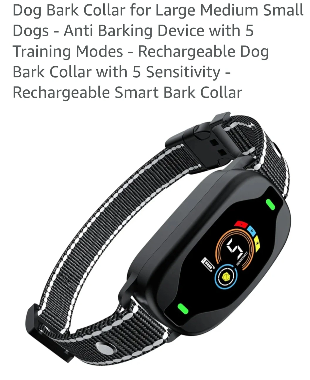 DOG BARK COLLAR for Large Medium Small Dogs. It has an Anti Barking Control Device, with 5 training modes and 5 sensitivity levels. It's also rechargeable and waterproof, ready for all weather conditions!