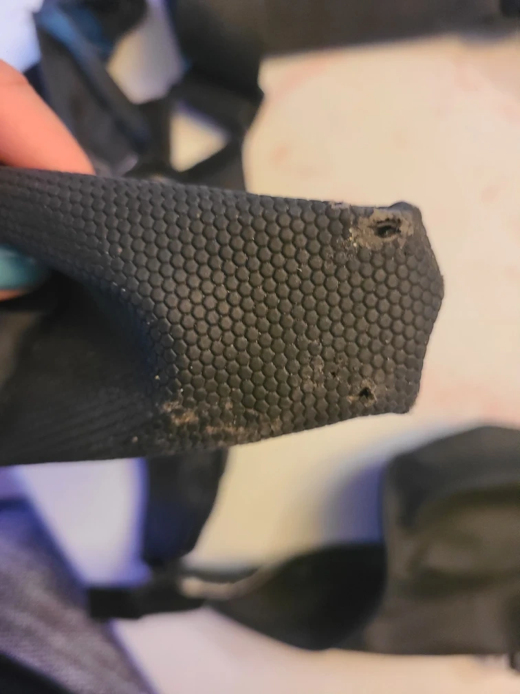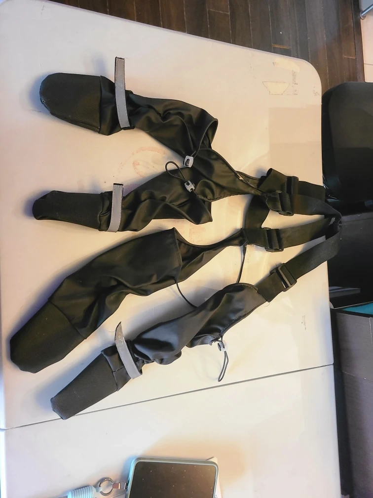 62Selling a set of dog booties with suspenders. For large dog. Max length of one leg is 24" and can be adjusted to be made smaller. Max paw width is 3" Price reflects the condition: - one of the foot straps is missing - pull tab on same foot missing -small hole on foot (see photo) Still functional as the boots are kept up with the suspenders