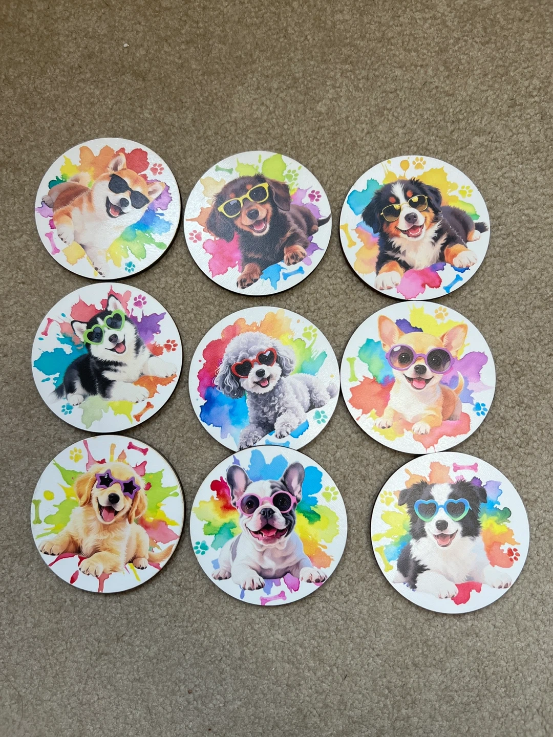 Set of nine adorable coasters featuring different dog breeds wearing sunglasses and set against a colourful watercolor background! Perfect for any dog lover's home