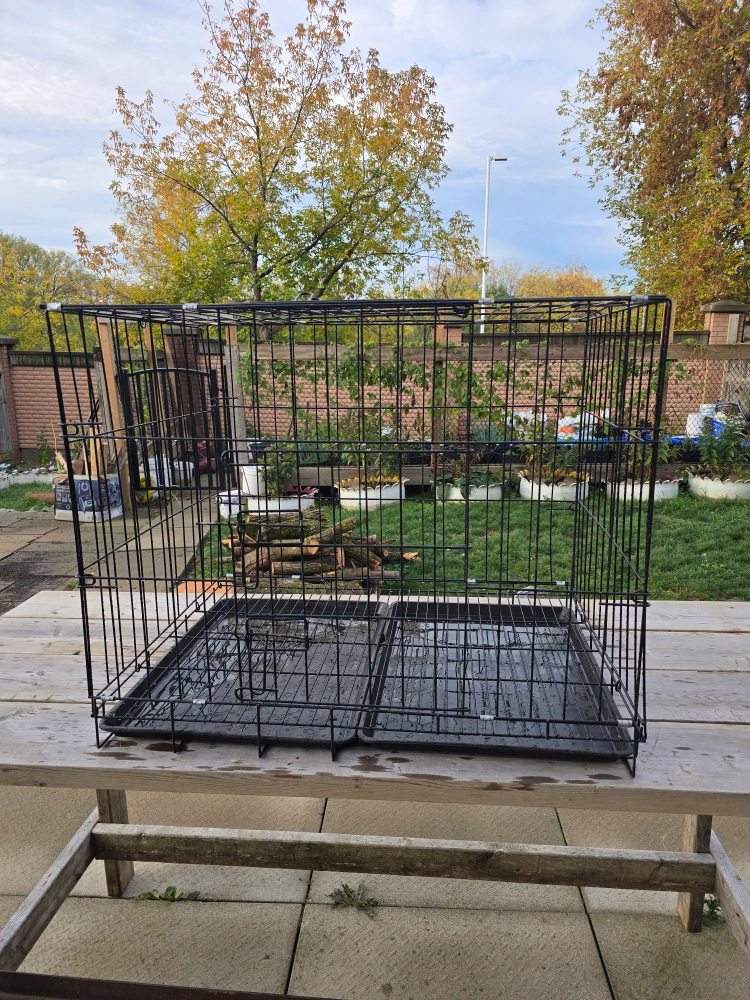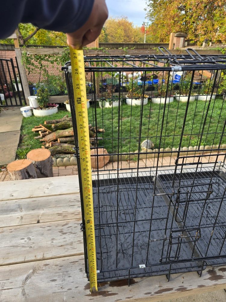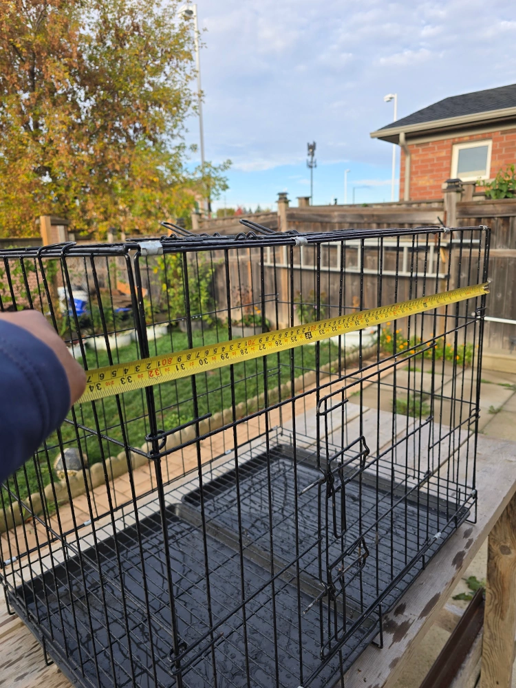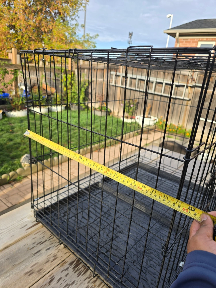 Selling a sturdy dog cage in good condition! It measures approximately 26 inches in height, 32 inches in length, and 23 inches in width. Perfect for providing a safe and comfortable space for your furry friend