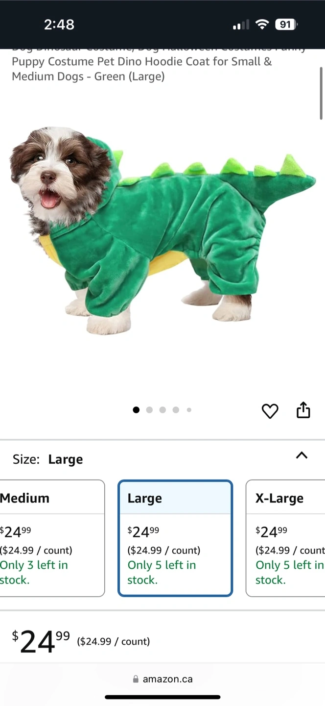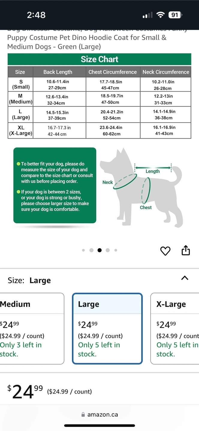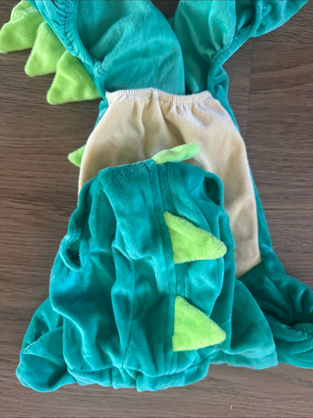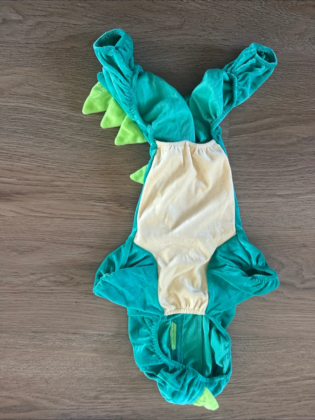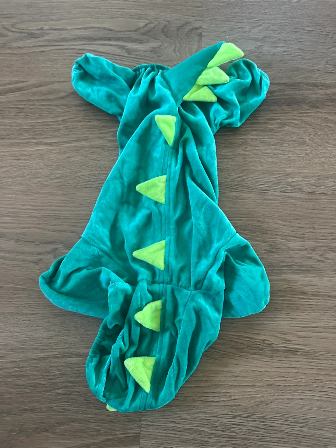 Selling a cute puppy dinosaur costume! It's a green dino hoodie coat, perfect for small to medium dogs. The size is Large. It's in great condition and ready for a new furry friend! See last photo for sizing