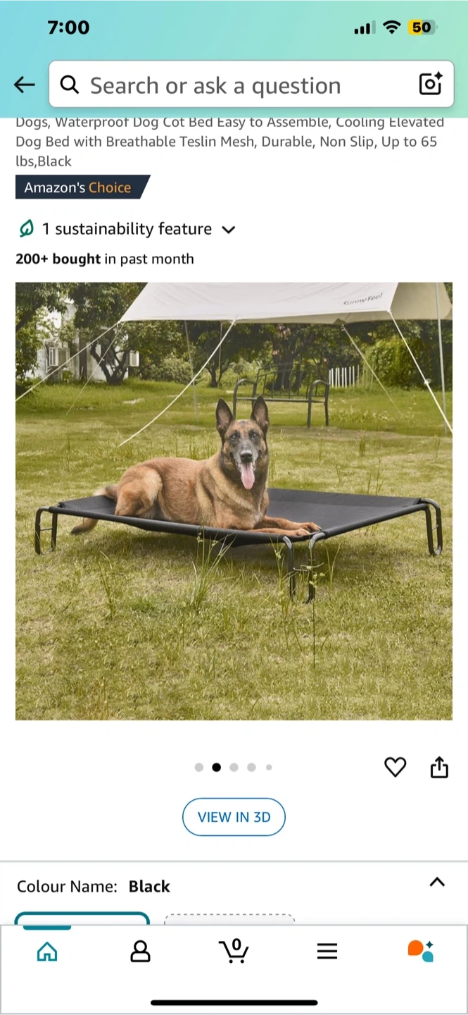 Selling a black, waterproof dog cot bed. It's easy to assemble and provides cooling elevation for your furry friend. The bed features breathable Teslin mesh and is durable with a non-slip design. It can hold up to 65 lbs.