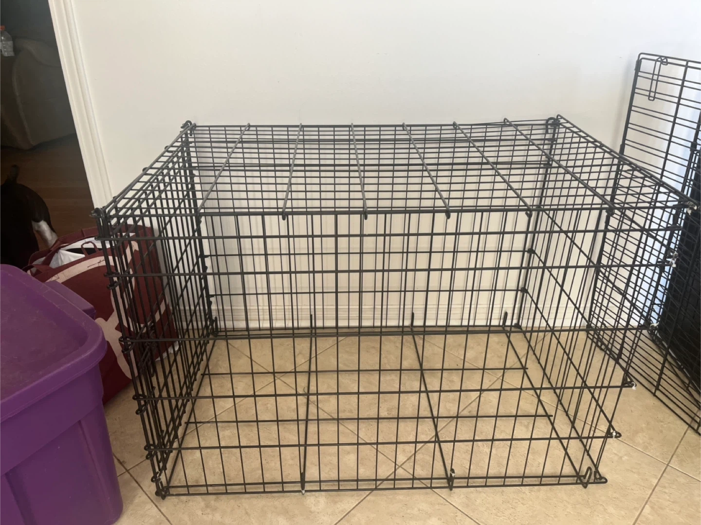 10Selling a used dog crate. It's in good condition and ready for a new home for your furry friend! The crate is made of black metal.