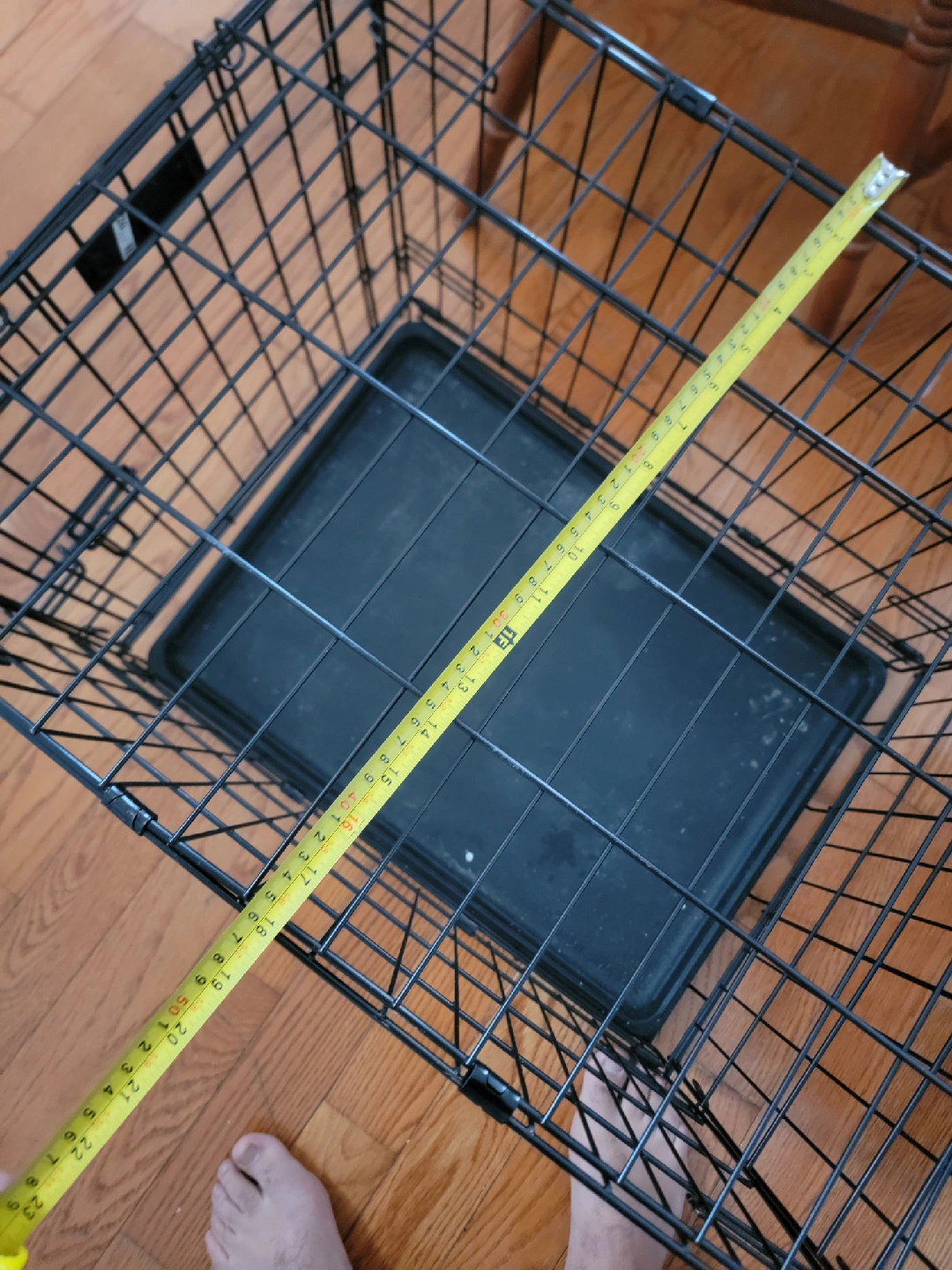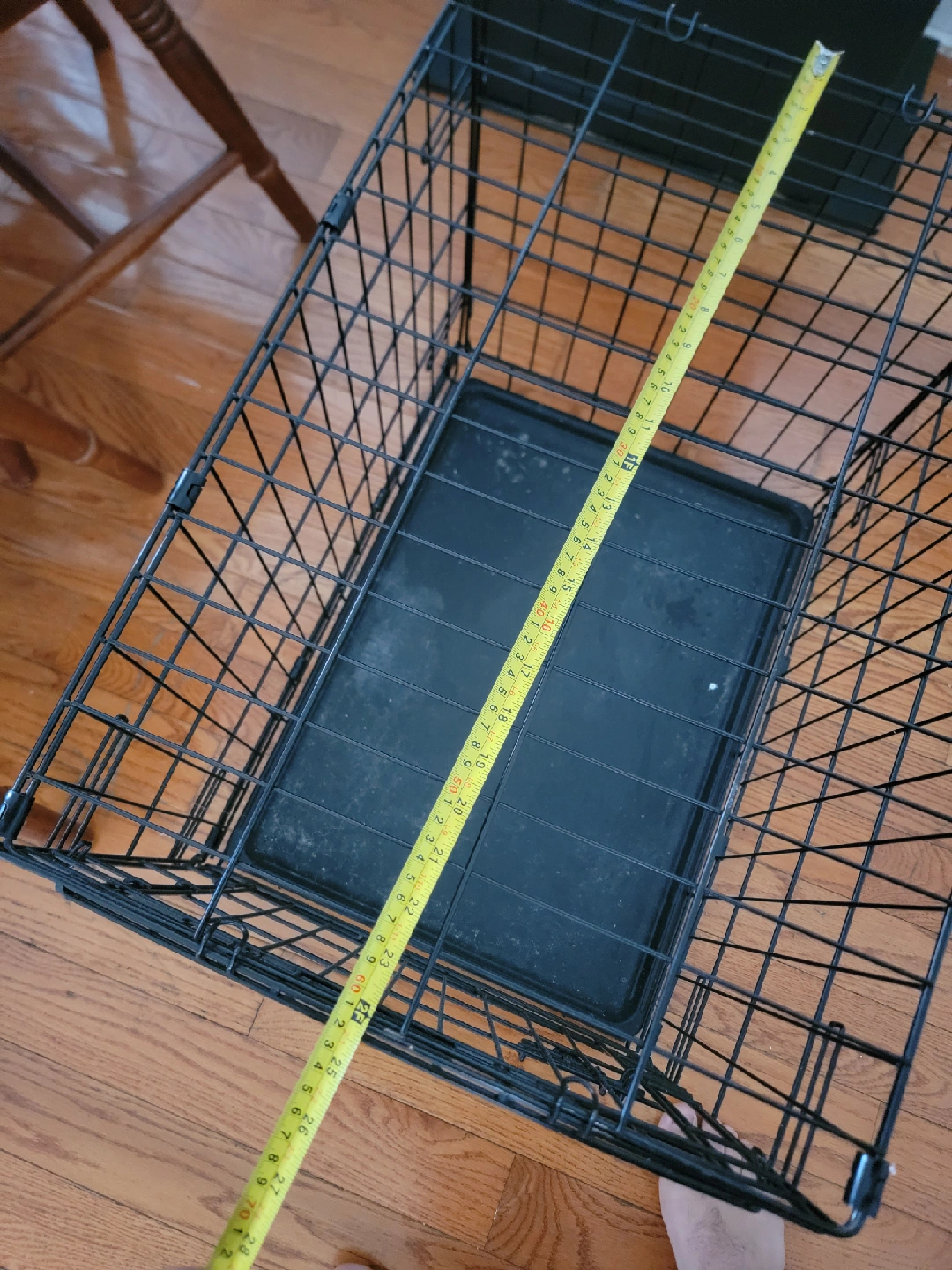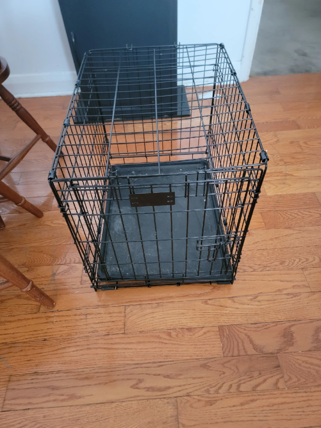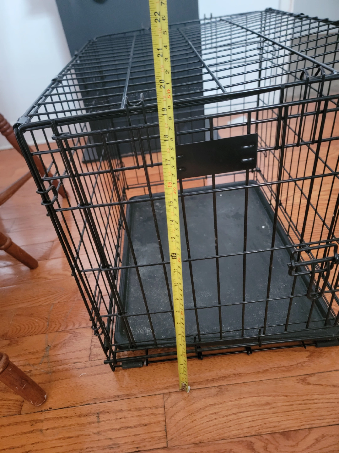 Selling a black wire dog crate. It's in good condition and measures approximately 22 inches in height and 23 inches in length. Perfect for small to medium-sized dogs!