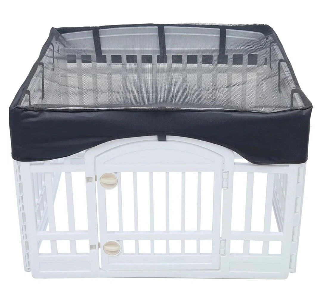 5White plastic dog crate with a black mesh top cover. It has a door on the front side. in good condition, mash has no tears