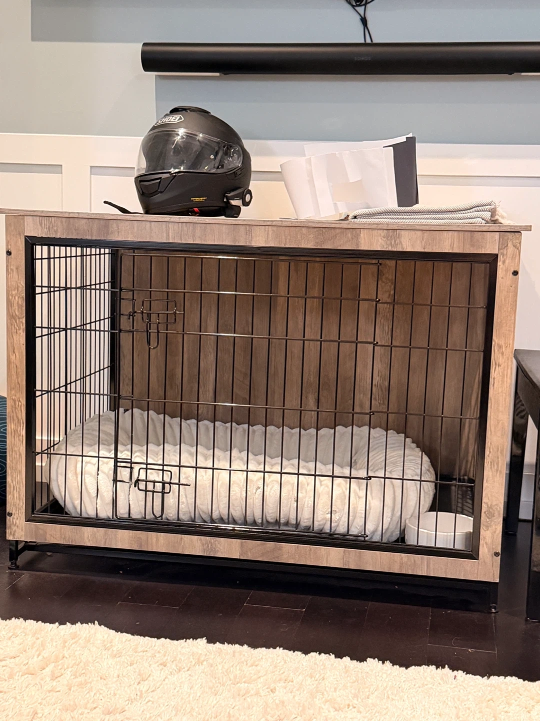 60Selling a dog crate that doubles as an end table! It's in great condition and is perfect for integrating your pet's space into your living area seamlessly. The crate features a sturdy metal frame with a wooden top, giving it a stylish and functional design. Great for a bigger dog