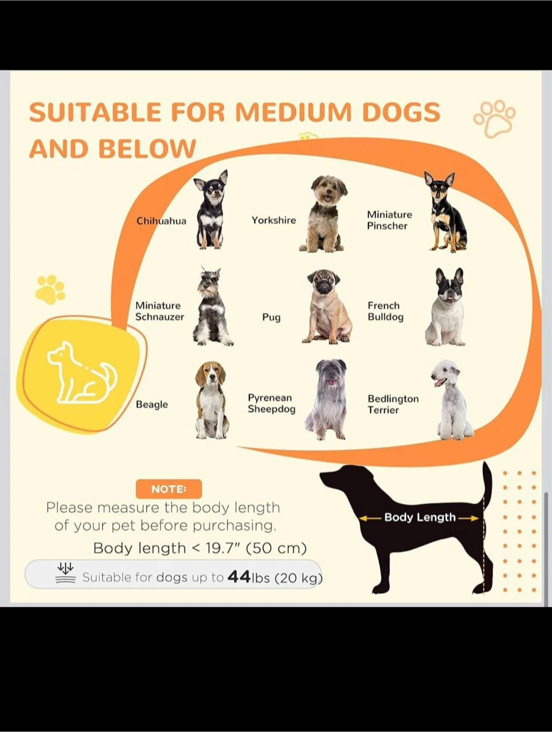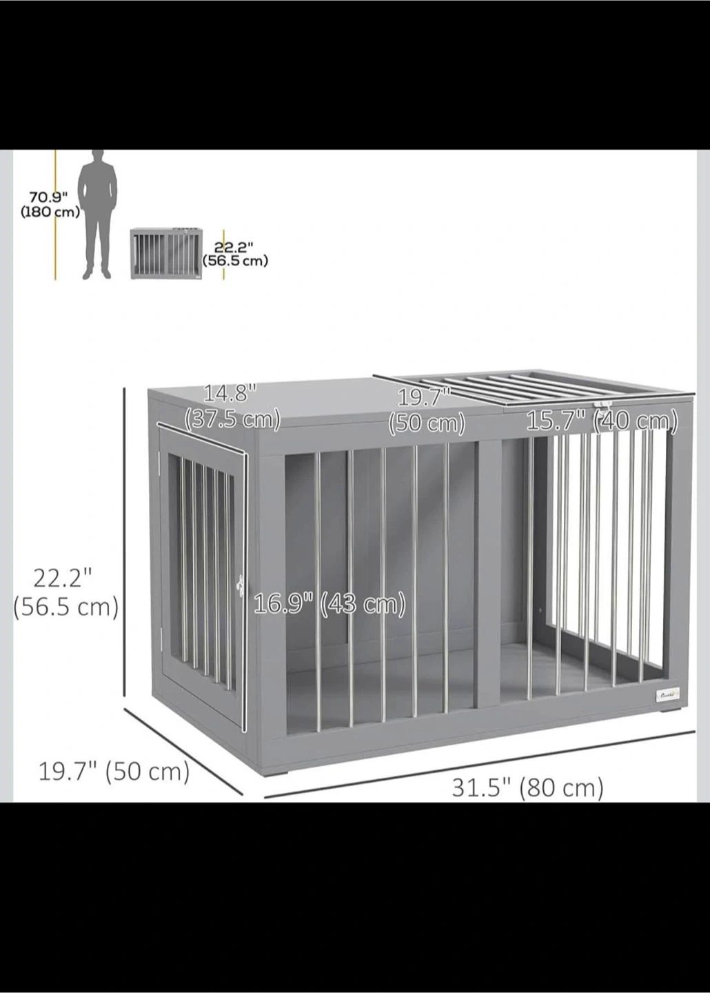 23This multifunctional dog cage can also be used as an end table! It's suitable for medium dogs and below, with a body length of less than 19.7" (50cm). It's suitable for dogs up to 44lbs (20kg). The dimensions are 31.5" (80cm) x 19.7" (50cm) x 22.2" (56.5cm).