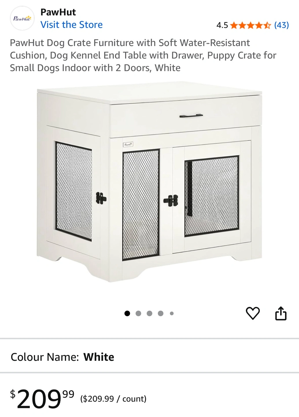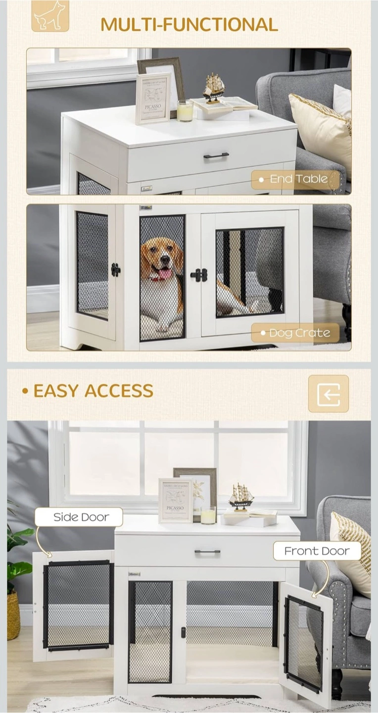 10This multi-functional PawHut dog crate can be used as an end table or a dog crate! It's suitable for small and medium dogs, with a body length less than 19.7" (50cm). It features easy access with both a side and front door. The dimensions are: - 29.5" (75cm) height - 31.5" (80cm) width - 22.8" (58cm) depth Originally bought for $209.99 plus taxes