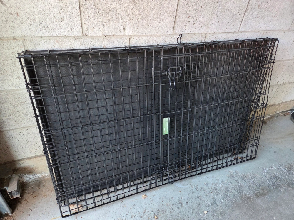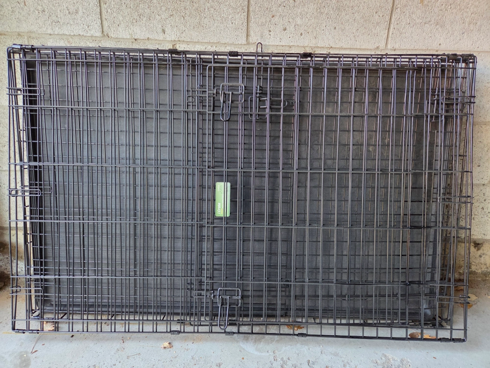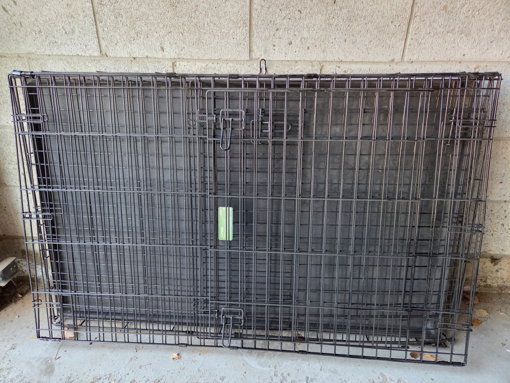 Selling a large dog crate! It's in great condition and ready for a new furry friend. Perfect for providing a safe and comfortable space for your dog. Double door 121 cm L X 75 cm W X 81 cm H. Leak-prof Pan, Divider Panel, Black color. Easily foldable.