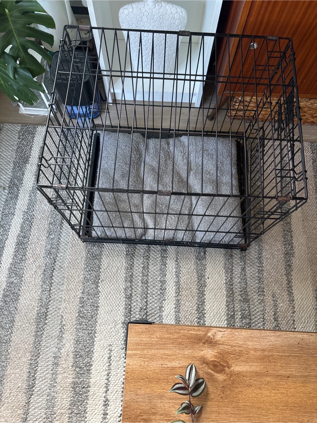 5Selling a gently used dog crate in great condition! It comes with a comfy grey pad inside, perfect for your furry friend to relax. The crate is sturdy and well-maintained, ready for a new home