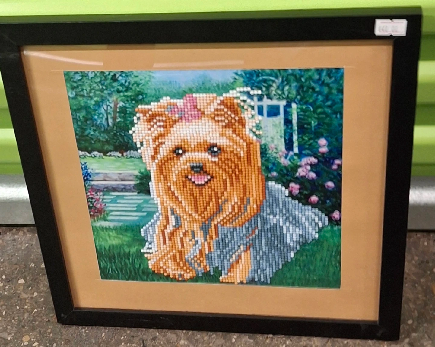 87This is a framed diamond art piece featuring a cute dog. It's a unique and eye-catching piece of decor!