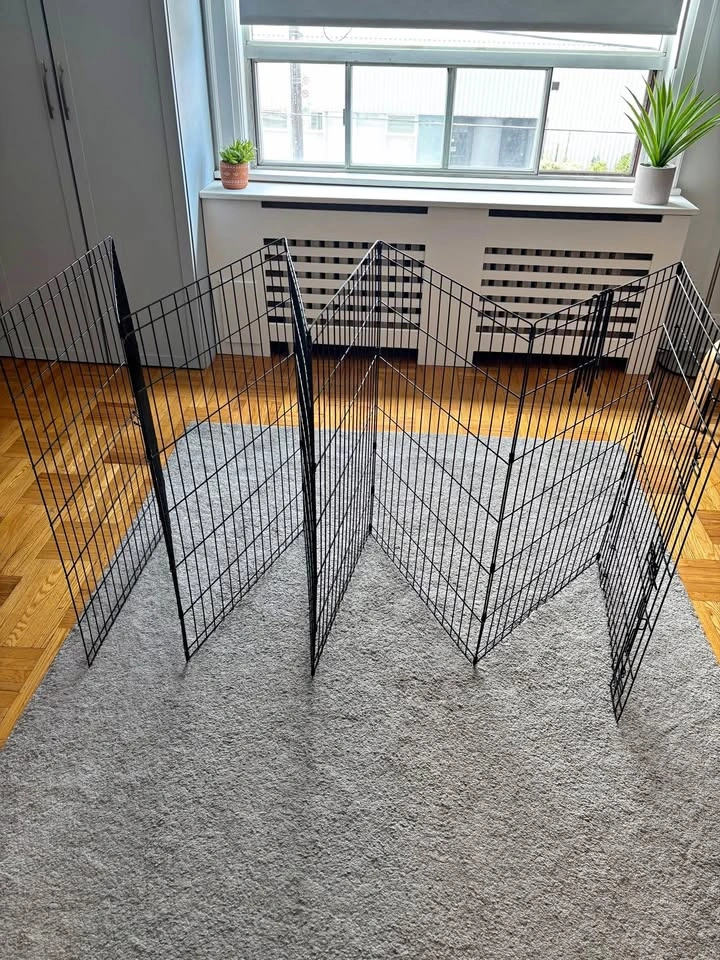 652 for $150 or 1 for $75. Jane and Annette. Essentials Exercise Pen with Door has a step-through door that ensures your pet's safety during playtime while providing 16 square feet of space to move and exercise. Essentials Exercise Pens feature a slide bolt latch and a strong and durable patented LapLock Technology, reinforcing the perimeter of the door resulting in superior security to slide bolt systems alone. The 8 connected 24" wide hinged panel design allows for multiple configurations and can attach to Essentials Wire Crates, giving your dog the freedom to move and play while adding the security and comfort of a crate. The large step-through door features two secure slide-bolt latches and provides convenient and easy access for people and pets. For use both indoors and outdoors, the included ground anchors make it easy to create a safe outside play area. Essentials Exercise Pens fold flat for convenient storage or transport and are easy to set up with no tools required. Essentials Exercise Pens can be used for a variety of pets such as dogs, rabbits, turtles, ducks, and more. Features: Safe & secure slide-bolt latch and multiple lock points provide added security for your pet Easy to set up and folds flat for transport, no tools required Large door opening, allows for convenient step-through access for people and pets Includes ground anchors for creating an outdoor play area Hinged panel design allows for multiple configurations Height 42”
