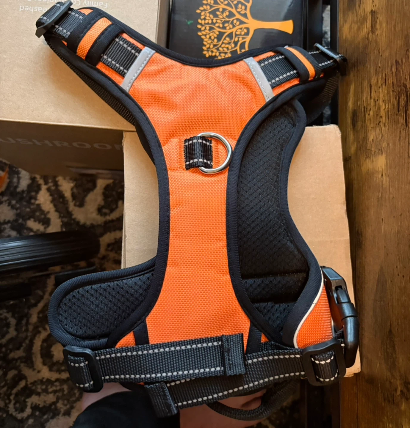 Selling new blue and orange dog harness in size M. It features reflective strips for safety and a comfortable, padded design. The harness is made of durable and waterproof oxford fabric with a lightweight mesh lining. It's adjustable to maximize your dog's comfort, with neck girth 14-19" and chest girth 16-25". It also features a zinc alloy ring on the chest and back for leash attachment