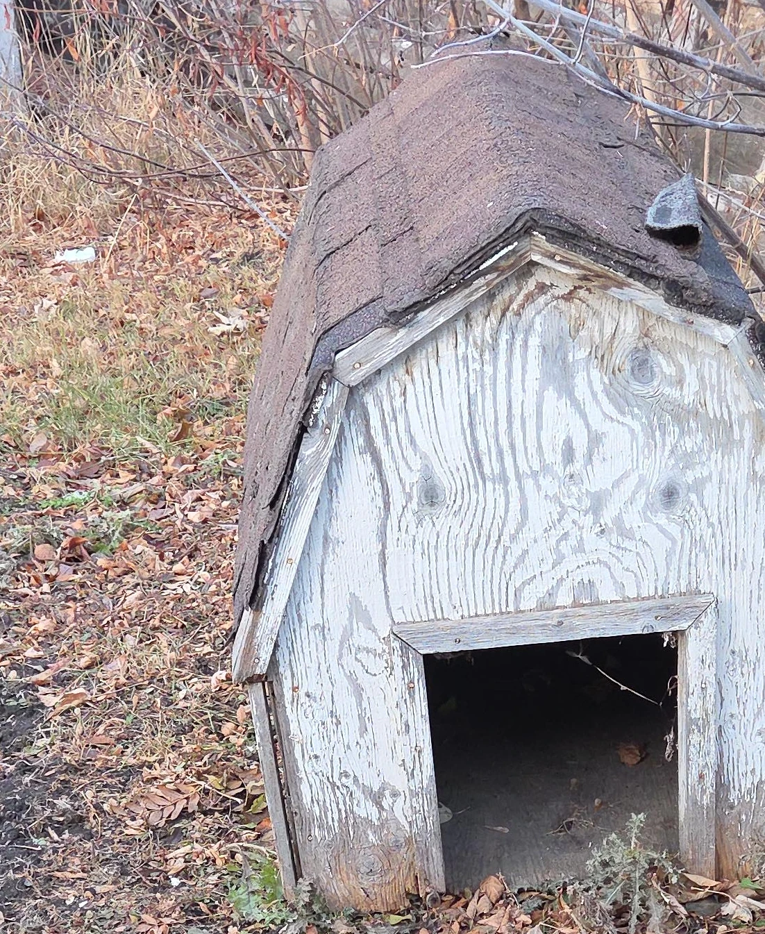 20Selling a dog house. It shows signs of wear and tear, as you can see in the photos. It's made of wood and has an asphalt shingle roof. Good for small to medium-sized dogs