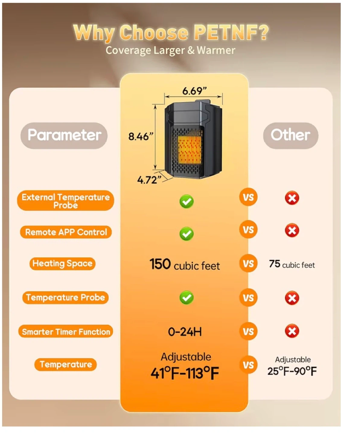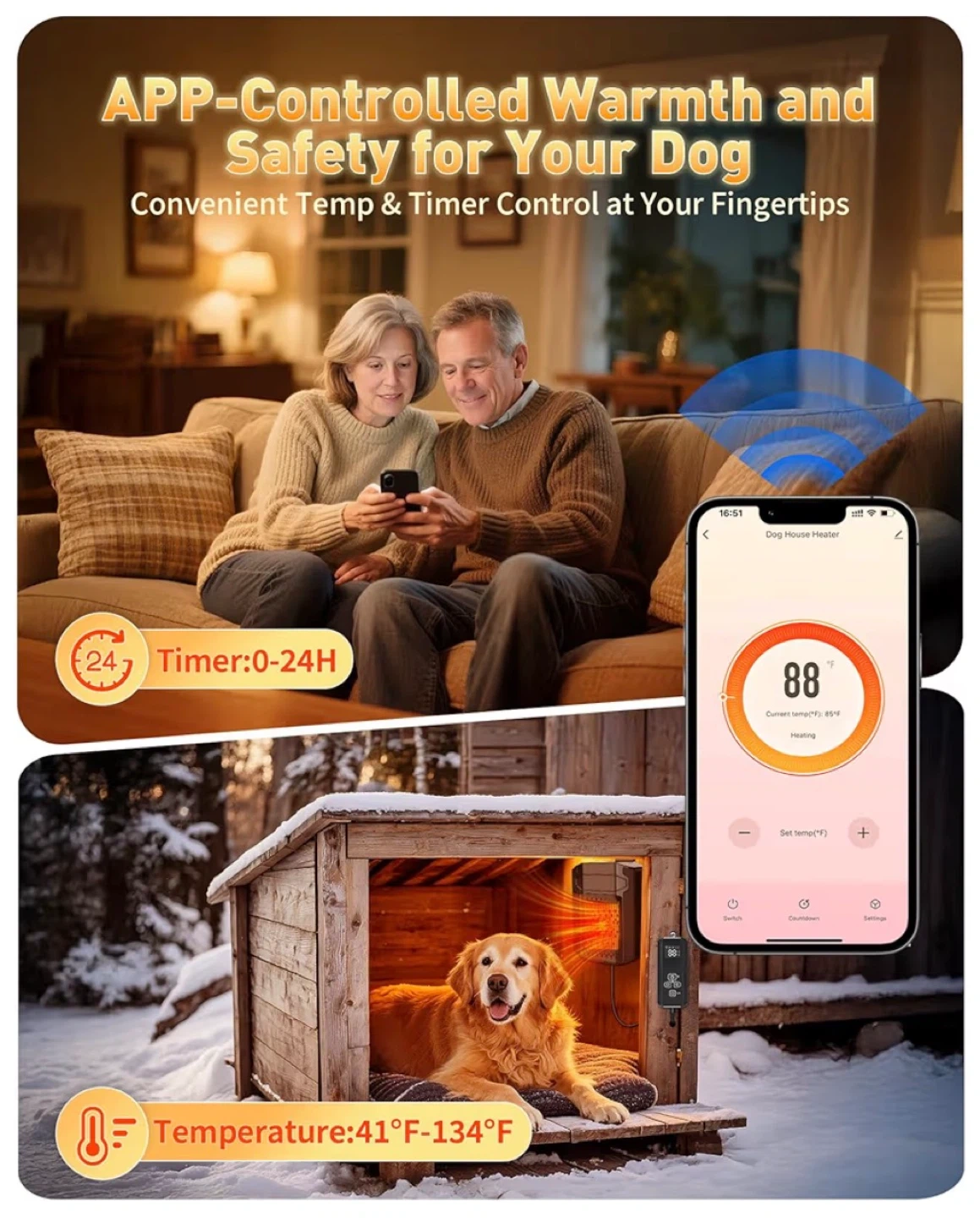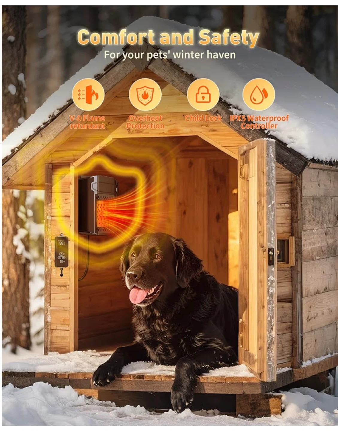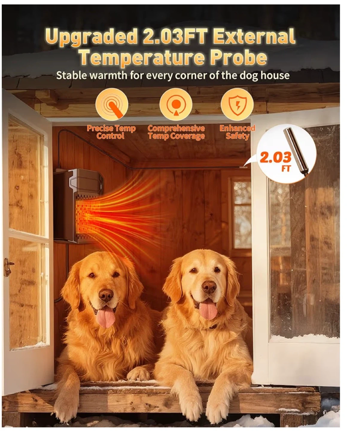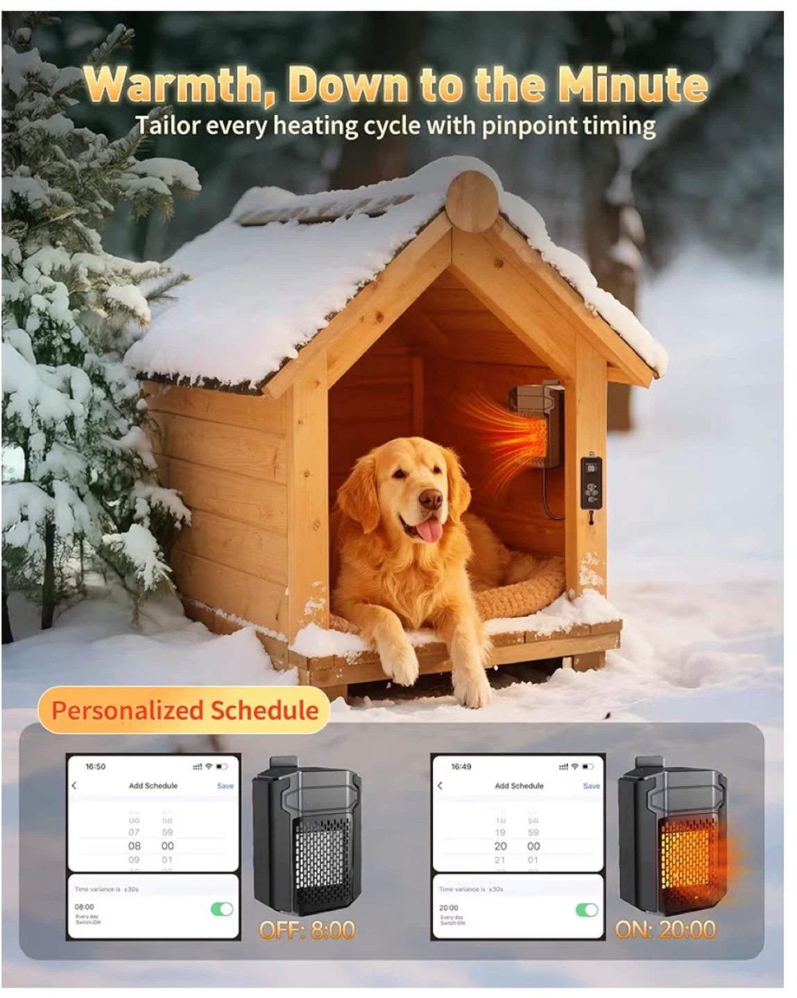 65Keep your furry friend warm and cozy with this dog house/chicken coop heater, equipped with app-controlled temperature settings ranging from 41°F to 134°F, and a 24-hour timer, ensuring a comfortable environment in spaces up to 150 cubic feet. I'm selling a new dog house heater that I never used. It comes with an upgraded 2.03FT external temperature probe for stable and comprehensive temperature coverage, alongside enhanced safety features. * App-Controlled * 24-Hour Timer * Temperature Range: 41°F - 134°F * External Temperature Probe It's still available if you're reading this, no need to ask! Grab it before someone else does. Pick up at my house and cash only please. If you have a pleasant experience purchasing from me, please leave a review.