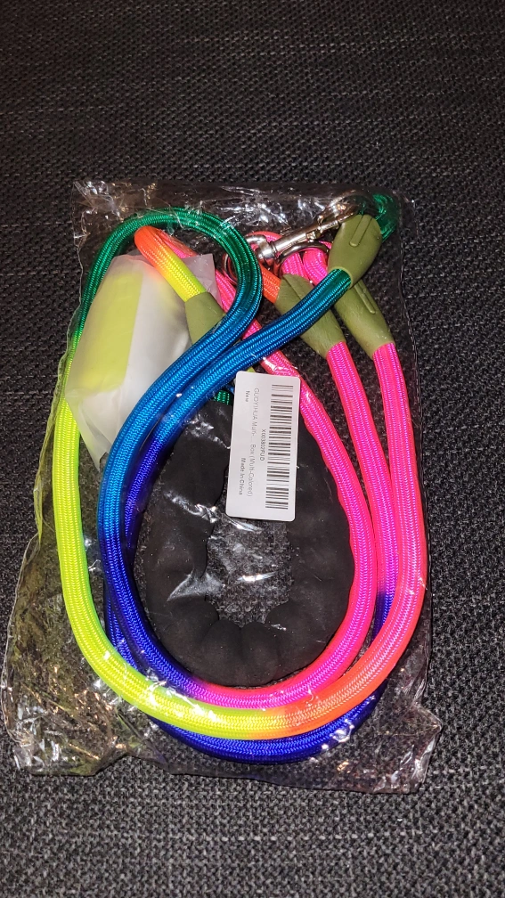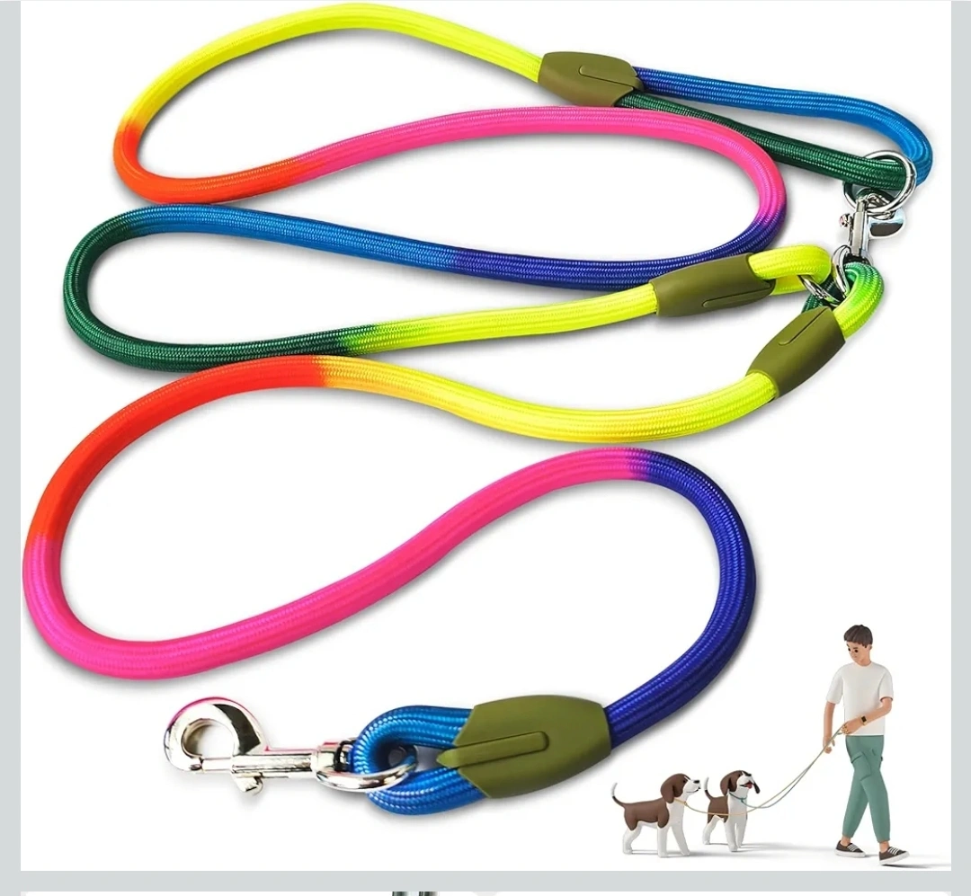 I'm selling a brand new dog leash. It's a rainbow-coloured rope leash. Perfect for walking your furry friend!