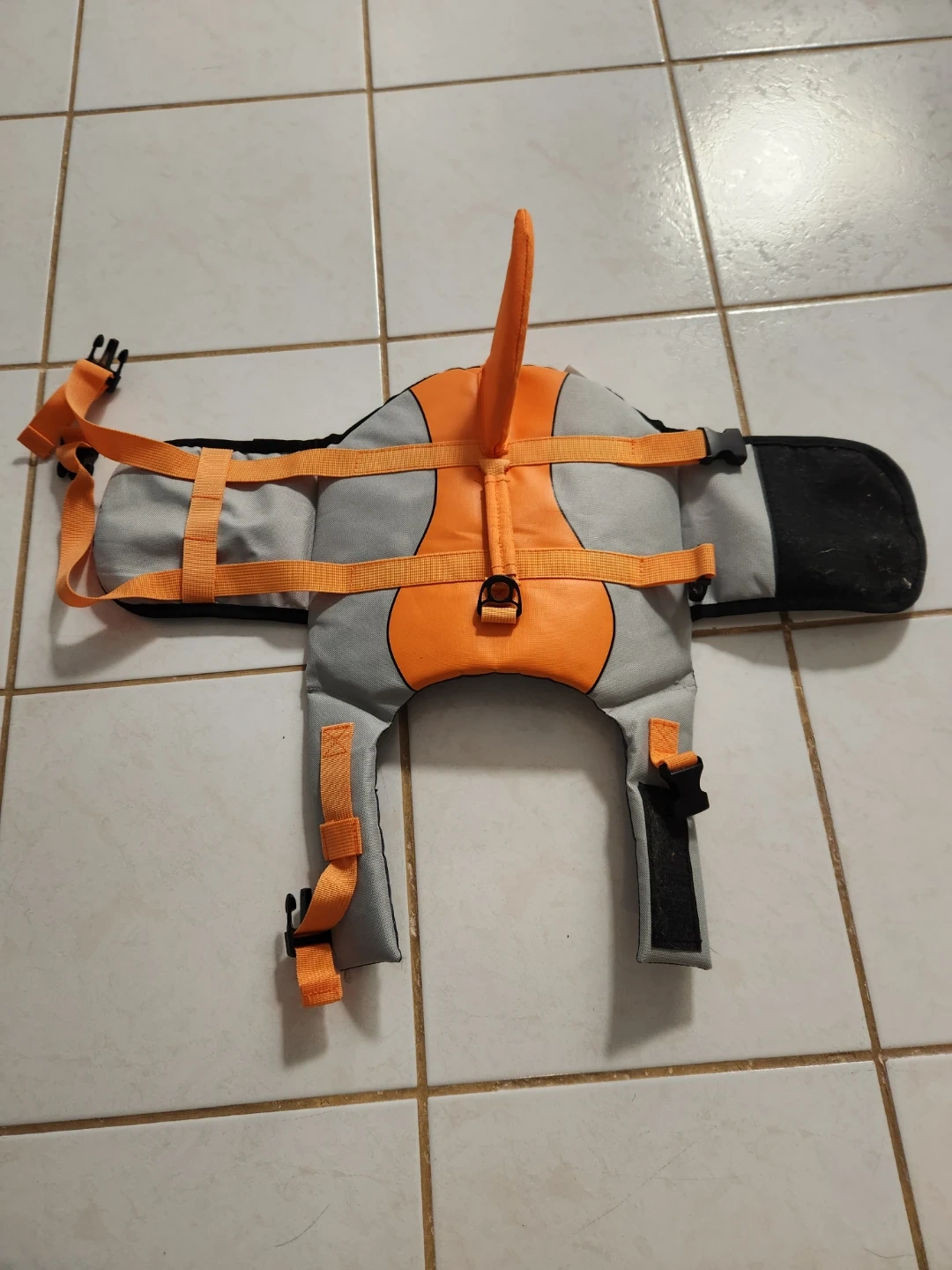 18Selling a dog life jacket in great condition! It's orange and grey, perfect for keeping your furry friend safe during water activities. It looks like it has a shark fin on the back, so cute!