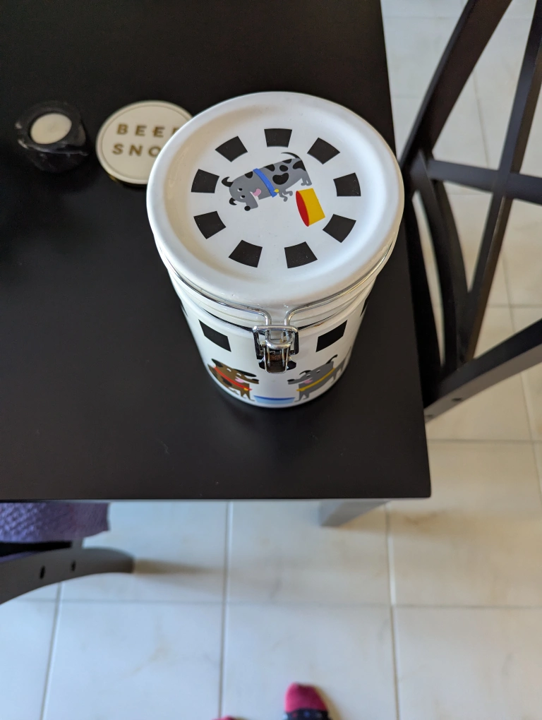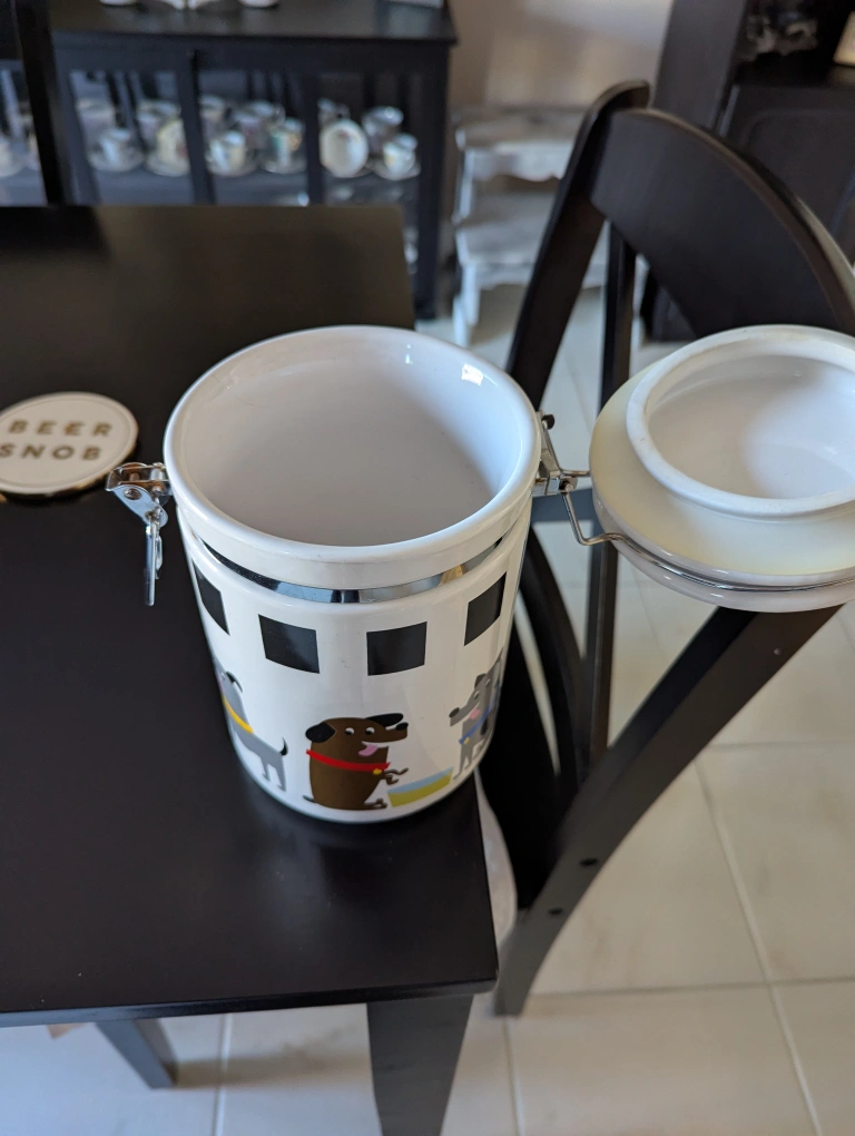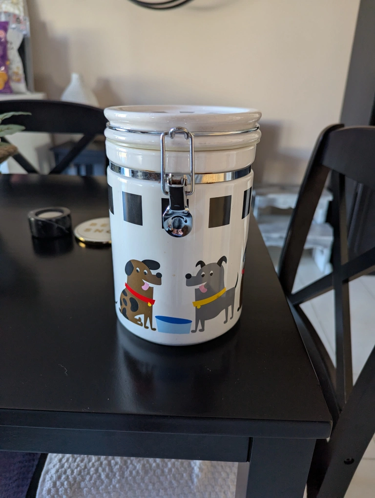 Here's a cute kitchen canister featuring a dog motif! It's perfect for storing treats or dry goods. The canister has a secure latch to keep everything fresh. It's in great condition and ready for a new home
