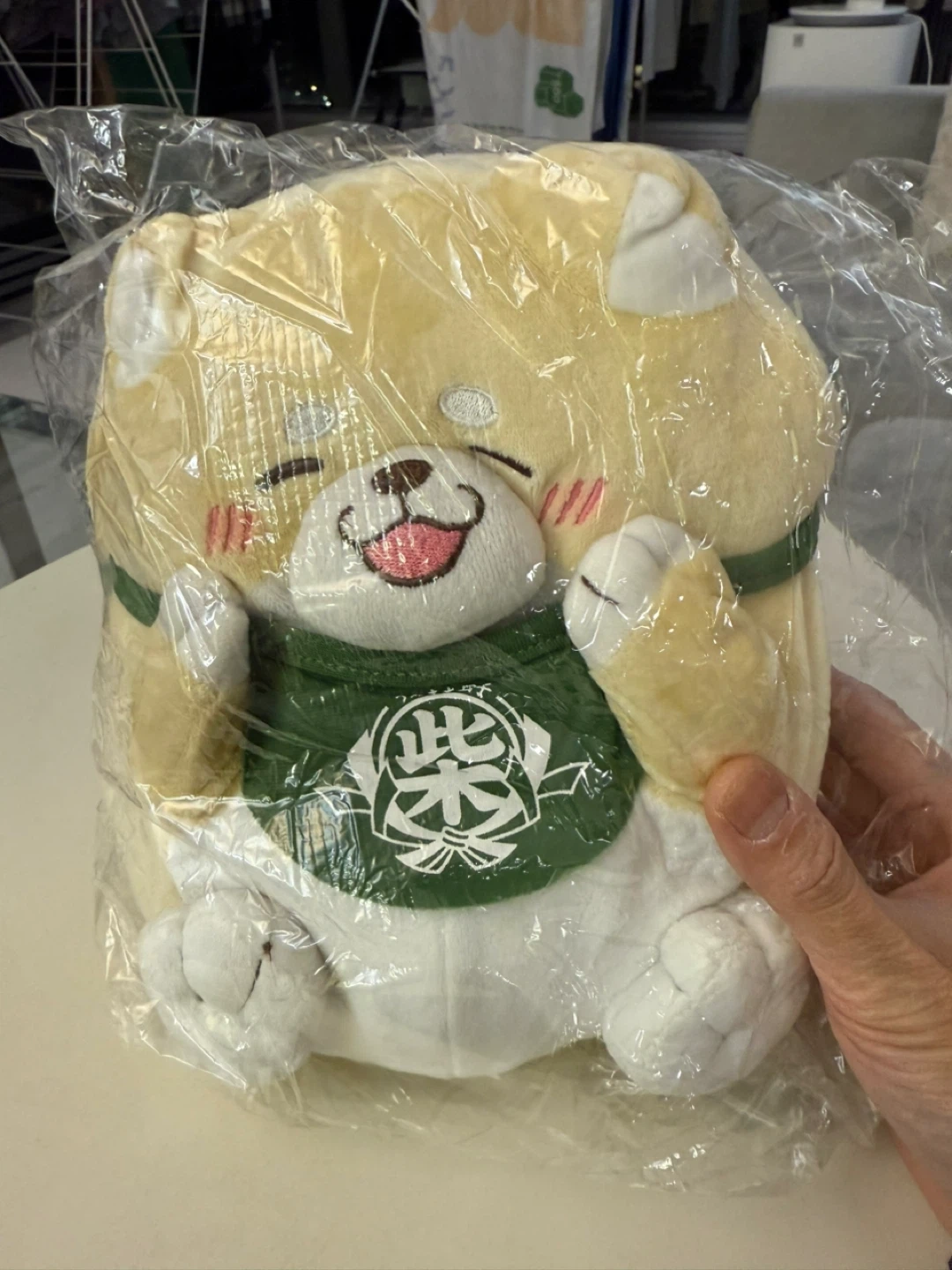 33Cute dog plush toy still in its original packaging! It features a sweet smiling face and a green bib with a unique design. Perfect for cuddling or as a decorative item!