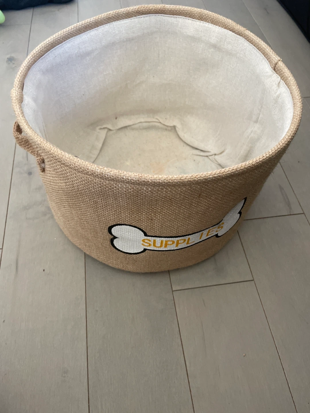 Here's a cute storage basket for your furry friend's supplies! It's in great shape and ready to help keep your pet area tidy